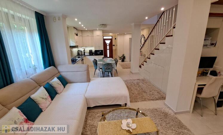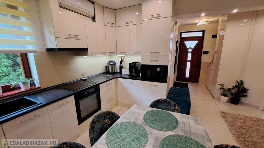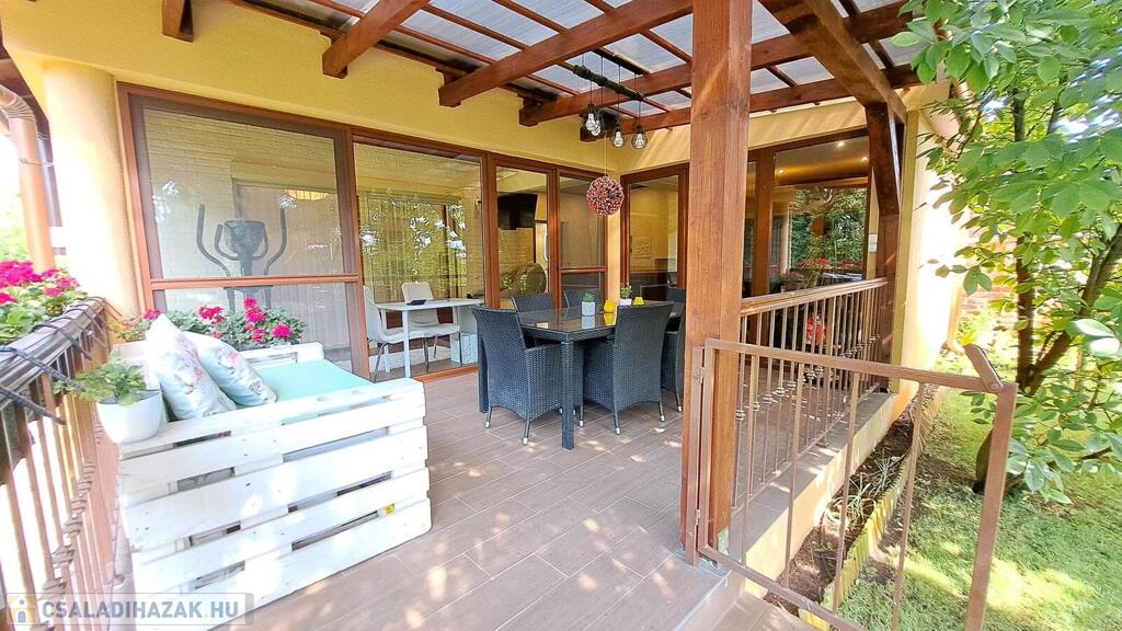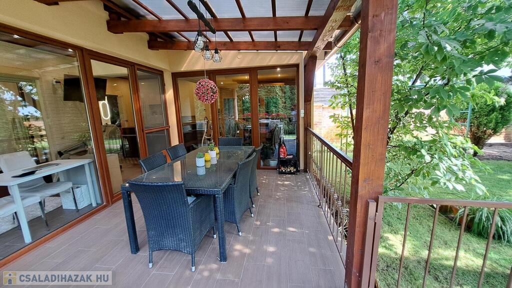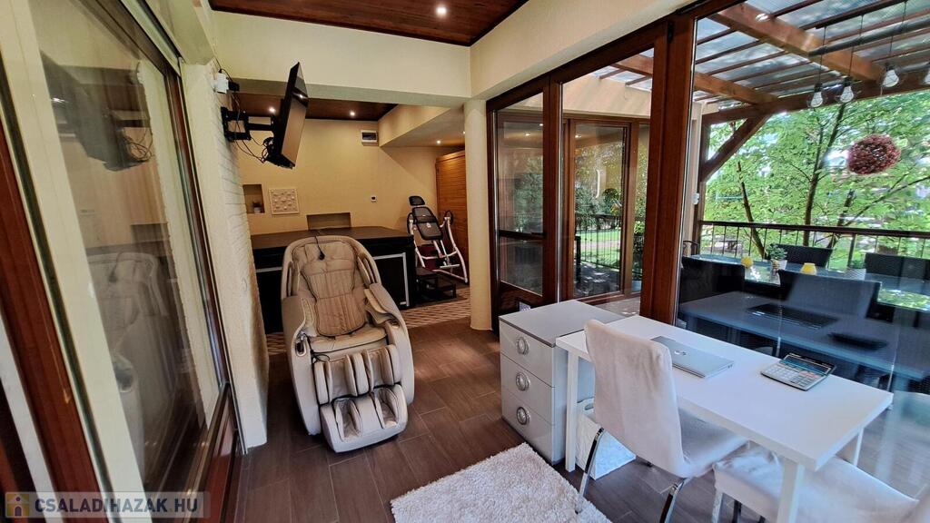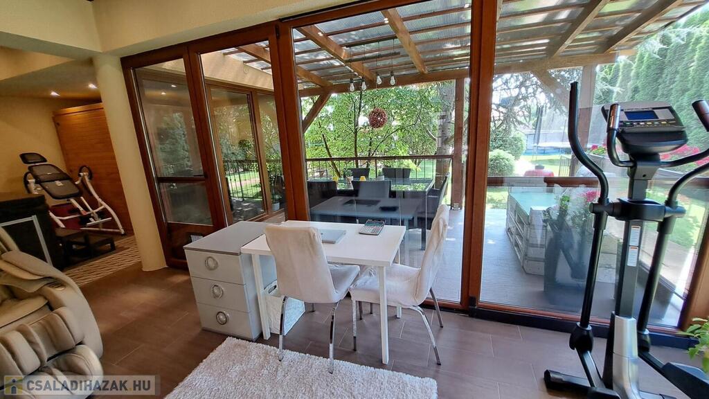 Extrák: Teljes körű wellness részleg (szauna, jakuzzi), elektromos padlófűtéses télikert, riasztó- és kamerarendszer, központi porszívó, elektromos redőny, ipari áram