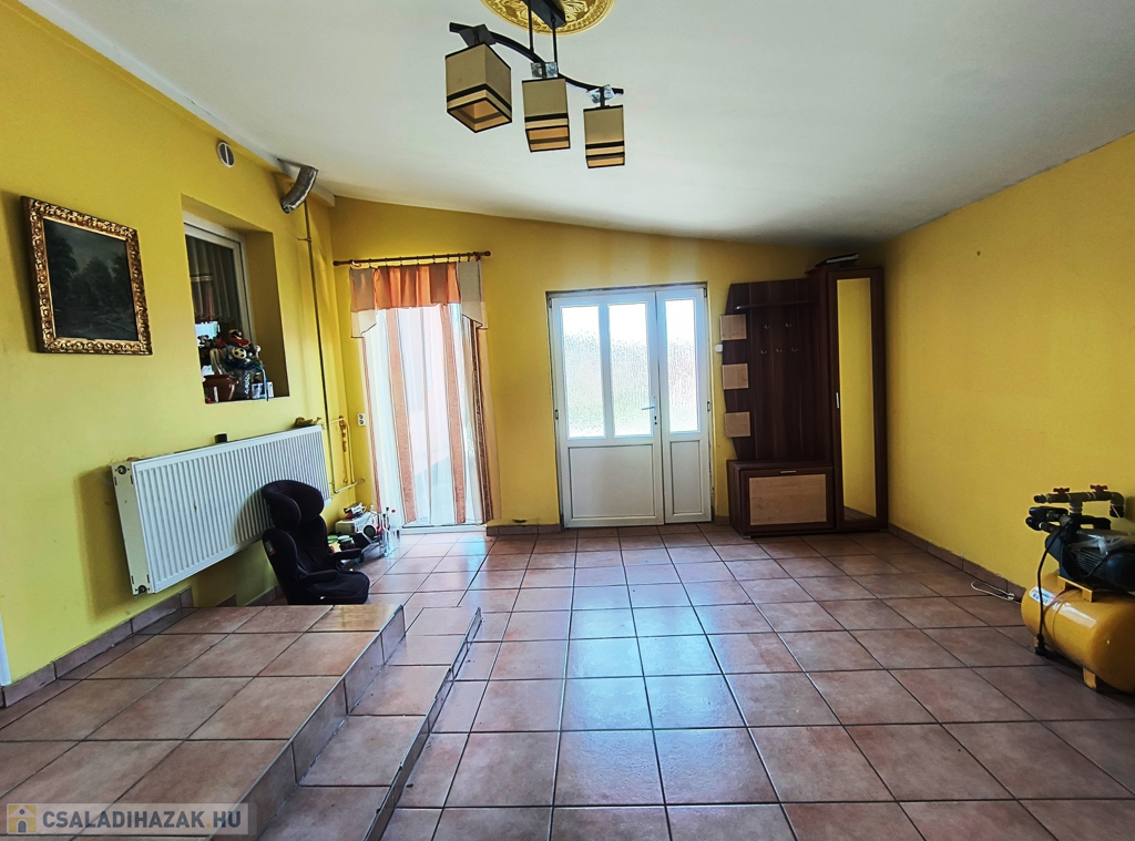 A házhoz kapcsolódik még egy 12 nm-es zárt( beépített terasz amely fűtéssel ellátott. A telek egy része térkövezett, és egy könnyűszerkezetes garázs valamint fedett gépkocsitároló található rajta. A ház jelenlegi vízellátását házivízmű biztosítja !!!