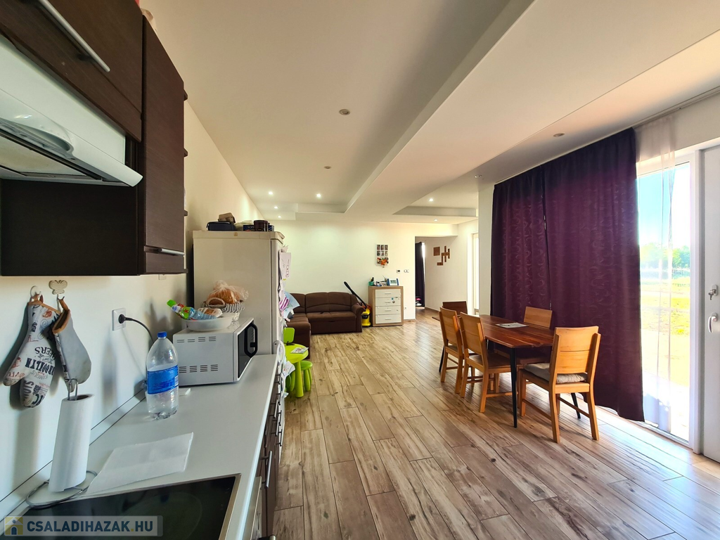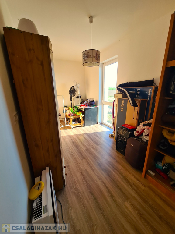 A garázsoknál kapcsolódó, külsőleg 15 cm-es szigeteléssel ellátott ikerház, egyedi konyhabútorral műanyag nyílászárókkal, és modern beltéri ajtókkal felszerelt. A két szintes ingatlan földszinten található 2 tágas szoba, (abból az egyikben kialakított gardrób), zuhanyzós fürdőszoba, amerikai konyha-nappali-35 nm-es teraszkapcsolattal. A felső szinten 2 külön nyílószoba, tágas fürdőszoba került kialakításra. A szép világos nappali energiatakarékos LED világítással lett felszerelve, ezzel is csökkentve az ingatlan energiafelhasználását.