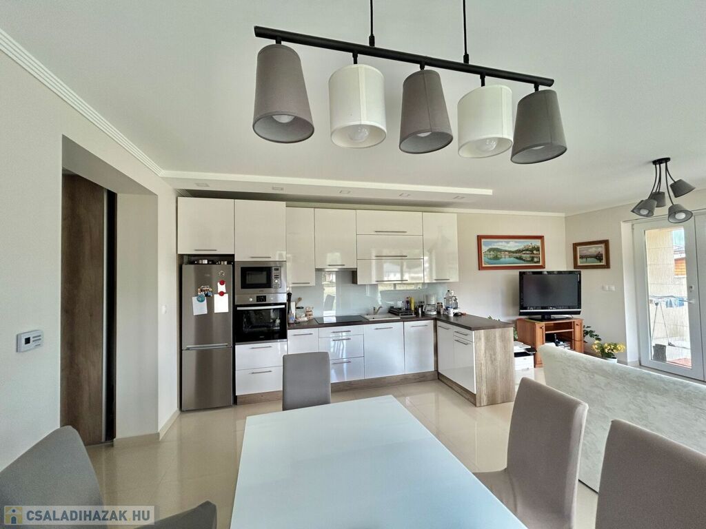 fűtése egyedi gáz- padlófűtés,klimatizált (hűtő-fűtő),műanyag nyílászárós,járólap, laminált padló burkolatú,egyedi, beépített, gépesített konyhabútor.