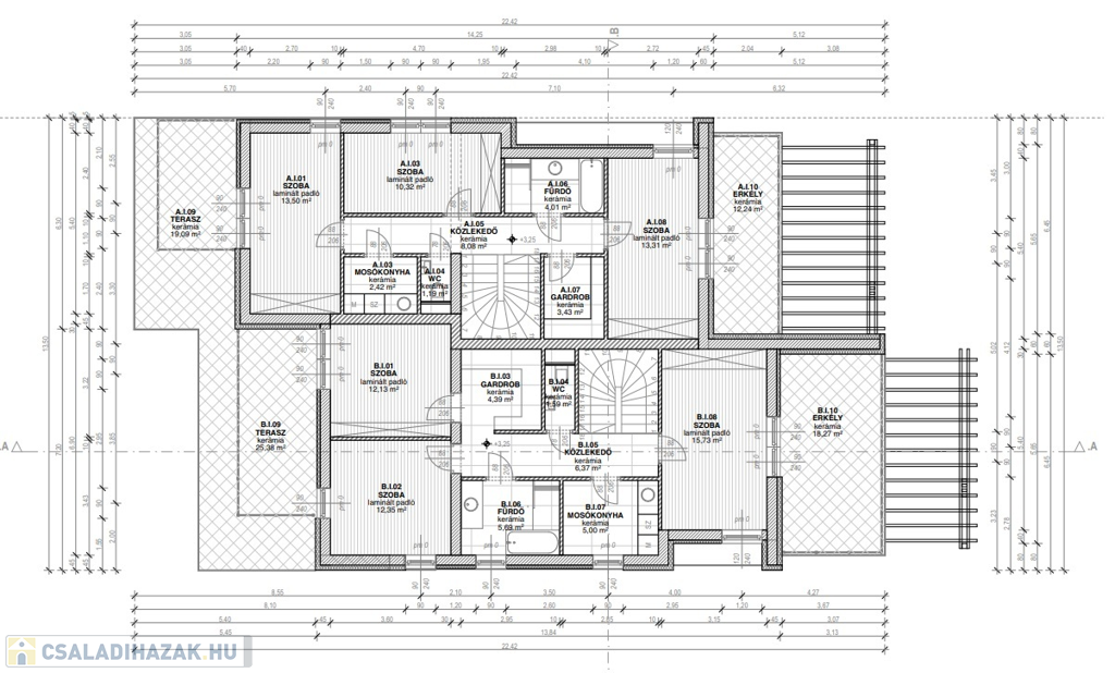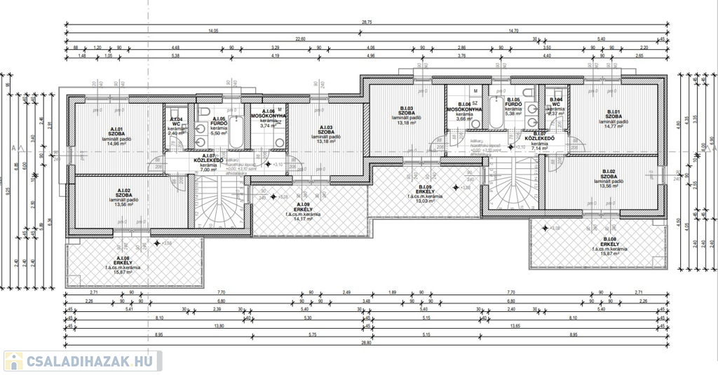 Emeleten: 3 külön nyíló szoba, 2 szobához nagy erkély, fürdőszoba-WC, gardrób, mosókonyha került kialakításra