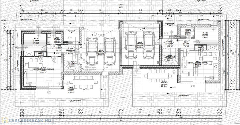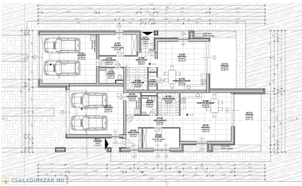 Földszint: amerikai konyha nappali-teraszkapcsolattal, 2 állásos garázs