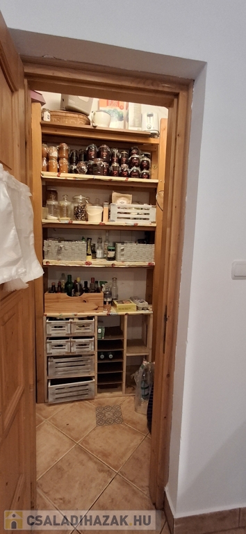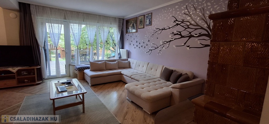 Az alsó szinten: amerikai konyha + nappali, 3 hálószoba, spájz, konyha, fürdő, wc. A nappaliban egy szuper cserépkályha, mely igazán megadja a ház egész hangulatát.