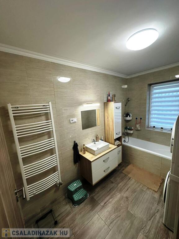 Tágas amerikai konyhás-nappali padlófűtéssel 3 külön nyíló hálószoba radiátorral Fürdőszoba padlófűtéssel és radiátorral 32 m²-es dupla garázs radiátorral Egyedi gáz fűtés padlófűtéssel Hűtő-fűtő klíma Műanyag nyílászárók szúnyoghálóval és redőnnyel