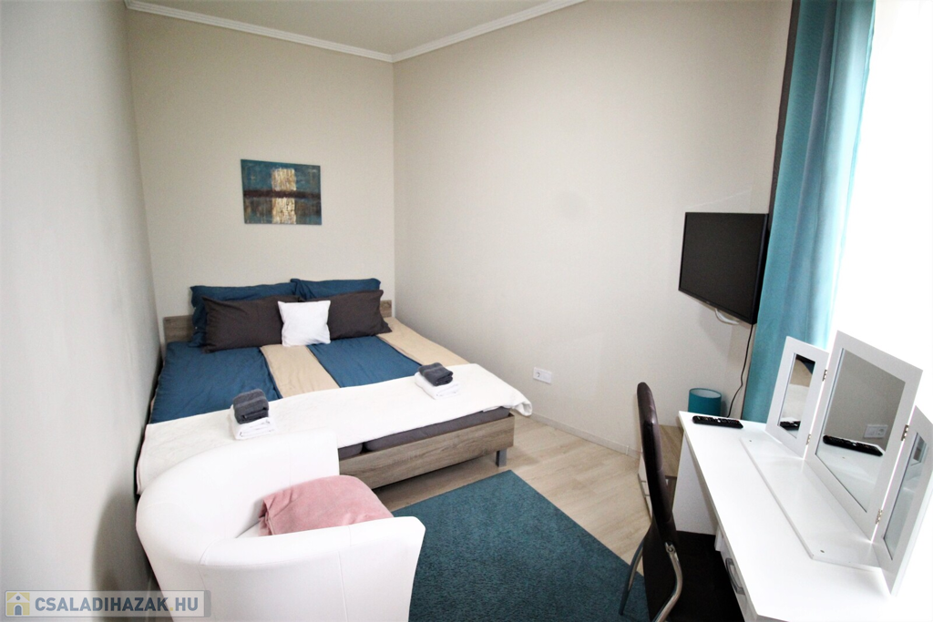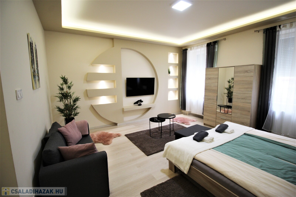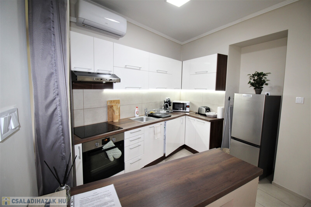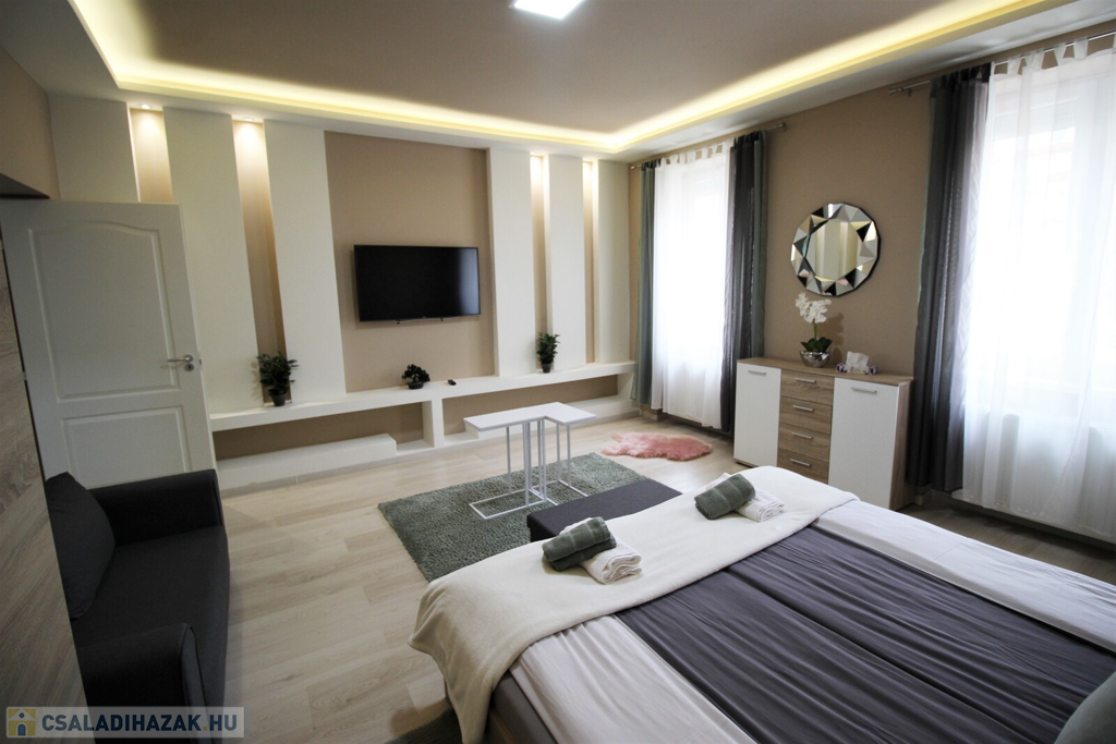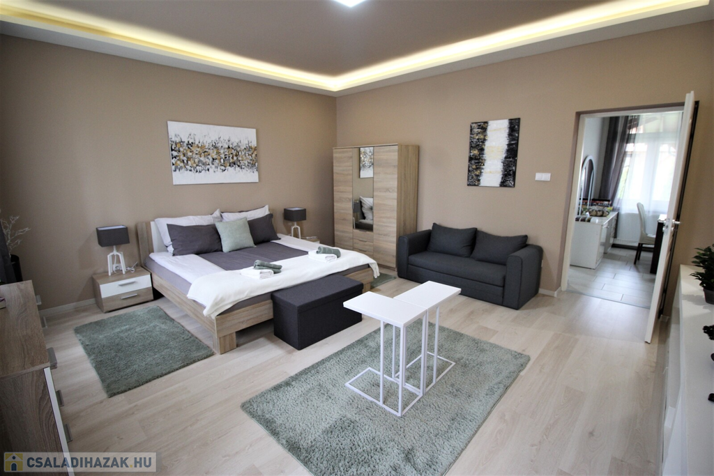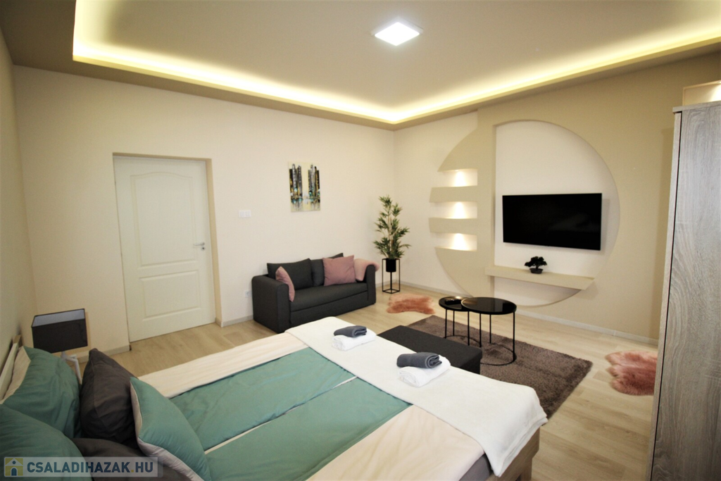 Az ingatlan külsőleg hőszigetelt, klimatizált, műanyag nyílászárókkal, LED fényforrásokkal, egyedileg tervezett beépített-gépesített konyhabútorral felszerelt.Az apartmanház kettő részre van osztva, minden közmű külön van, az első része 75 nm-es, 6 személy részére kialakított ebben, konyha-étkező, 2 tágas hálószoba, fürdőszoba, külön WC, kapott helyet.A másik rész 55 nm-es, ebben 4 személy részére kialakított, konyha-étkező, 2 hálószoba, fürdőszoba-WC került kialakításra.A házhoz tartozik még egy 20 nm-es fedett terasszal, parkosított udvar, 2 állásos garázs, valamint 5 autó parkolására kialakított terület.