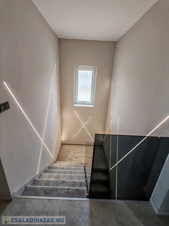 Földszint: előszoba, hálószoba + gardrób + fürdőszoba, nagy nappali-étkező-konyha, WC, mosókonyha, garázs, terasz