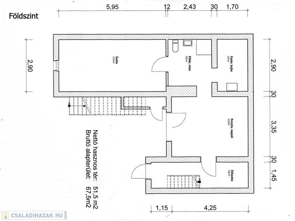 FÖLDSZINT ( 51,5 m2) helyiségei: 14,39 m2 Konyha-nappali, 6,82 m2 fürdőszoba, egy 17,26 m2-es szoba, 5,05 m2 kazánház. A földszintről a lakáson belülről egy előszobából is vezet lépcső az emeletre.