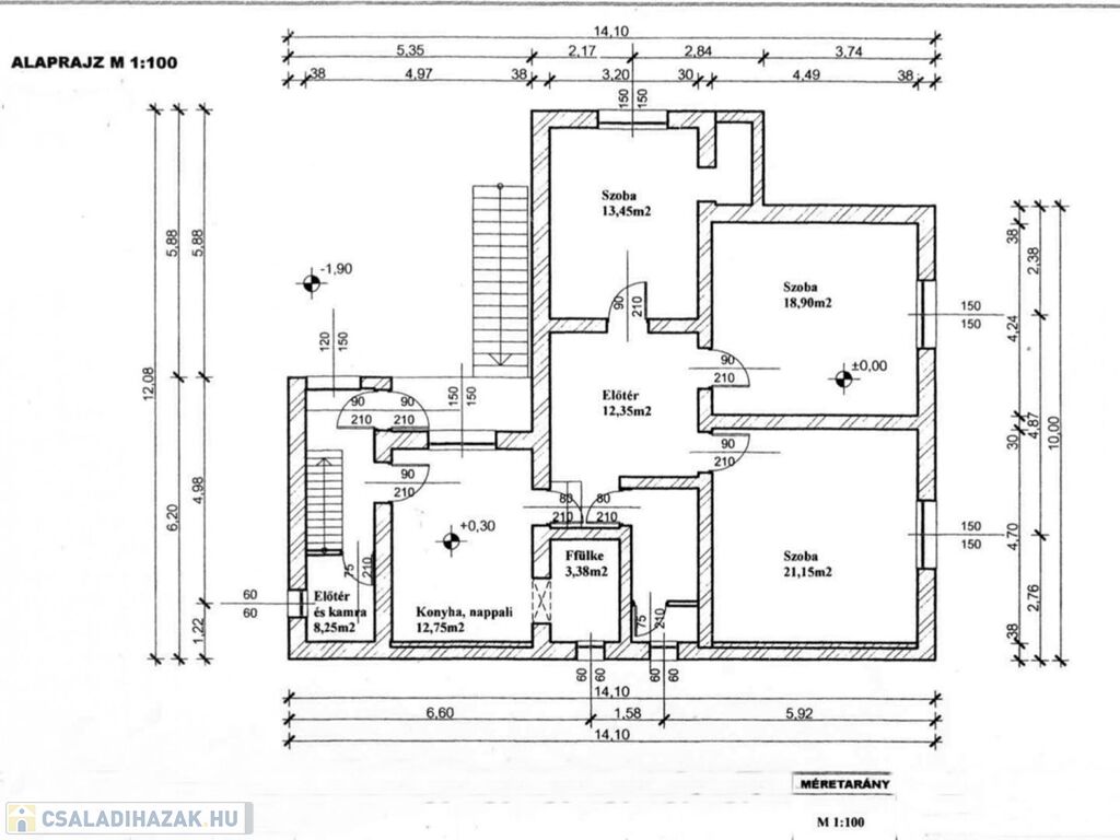 EMELET helyiségei (90,23 m2) : 4 szoba ( 13,45 m2, 12,35 m2, 21,15 m2, 12,75 m2) előszoba 12,35, konyha 3,38, előszoba 8,25 m2, előtér 8,25 m2, dolgozó szoba.