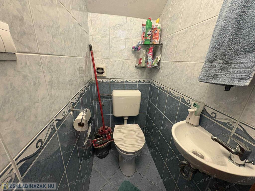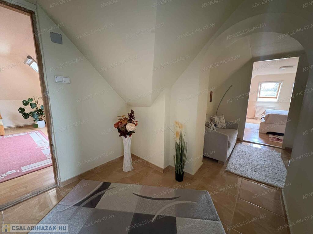 A tetőtérben további 2 hálószoba, fürdőszoba wc-vel, gardrób szoba, és közlekedő található.
