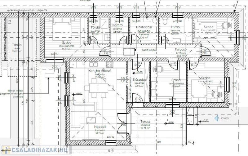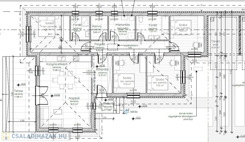 9 KW-os Daikin levegő-víz hőszivattyú + meleg víz tartály biztosítja a padlófűtést és a meleg víz ellátást. A szobánkénti hűtést szintén Daikin invertes hűtő-fűtő klímák biztosítják. Rejtett redőnytokos homlokzati kialakítás a nyílászárók felett. Épített utcafronti kerítés, színterezett lemez határoló kerítések a telekhatárok mentén, elektromos kapuk, kaputelefon, riasztó. A belső kialakítás, festés, burkolás, szaniterek, belső ajtók még választhatók. Számos referencia munka megtekinthető.