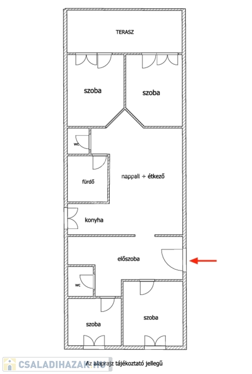 Felosztása: 4 hálószoba, 1 amerikai konyhás nappali, 2 mellékhelyiség, egy fürdőszoba, terasz.