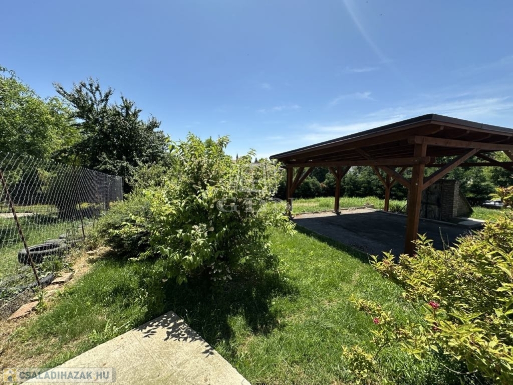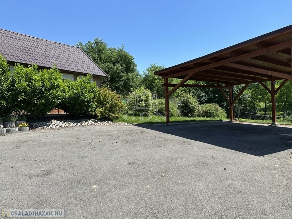 Az udvar egy része térkővel borított, két gépkocsi tárolására a fedett beállóban adott a lehetőség. A telken egy téglával kirakott, jó állapotú pince is teret kapott.