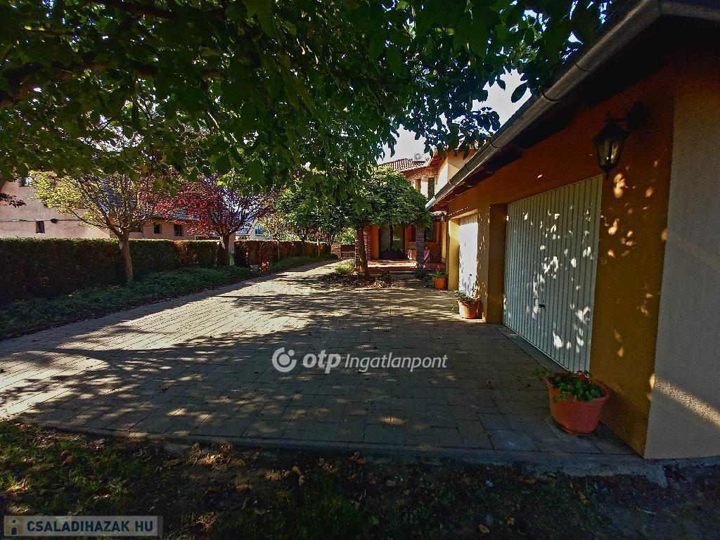 Az épületből az udvar felé egy hatalmas fedett teraszra lépünk ki, ami nemcsak összeköti a házat a kétállásos garázzsal, hanem a családi összejöveteleknek is bőséges helyet biztosít.