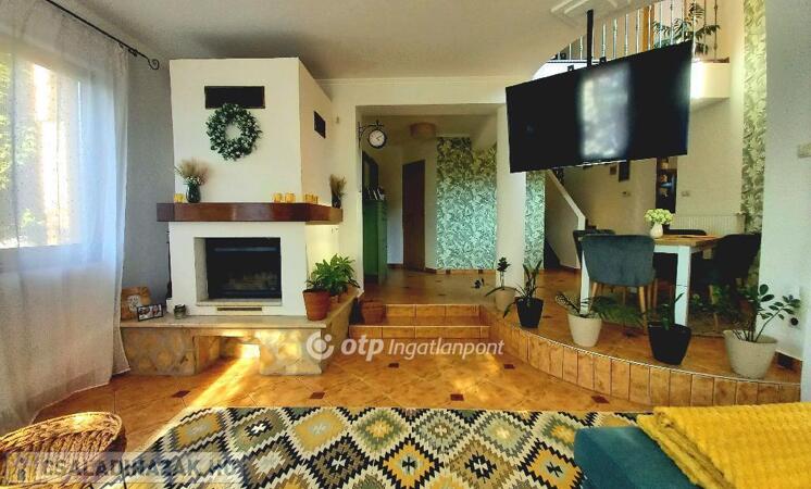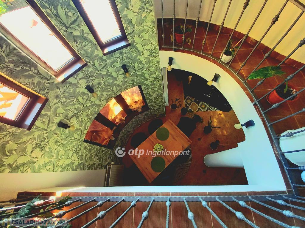 A ház belső kialakítása ötvözi a kényelmet, a stílusos eleganciát és a praktikumot. Az otthonosan berendezett, kandallóval is rendelkező, világos nappali ablakain át a fákkal és cserjékkel átgondoltan telepített udvarra tekinthetünk ki. Az egységes belső kialakítás és színvilág teremti meg azt a hátteret, amelybe a modern bútorok harmonikusan illeszkednek. A földszintem még konyha, étkező, tárolók, dolgozószoba és fürdő is helyet kapott. A galériás emeletre érve három hálószobát és második fürdőszobát találunk.