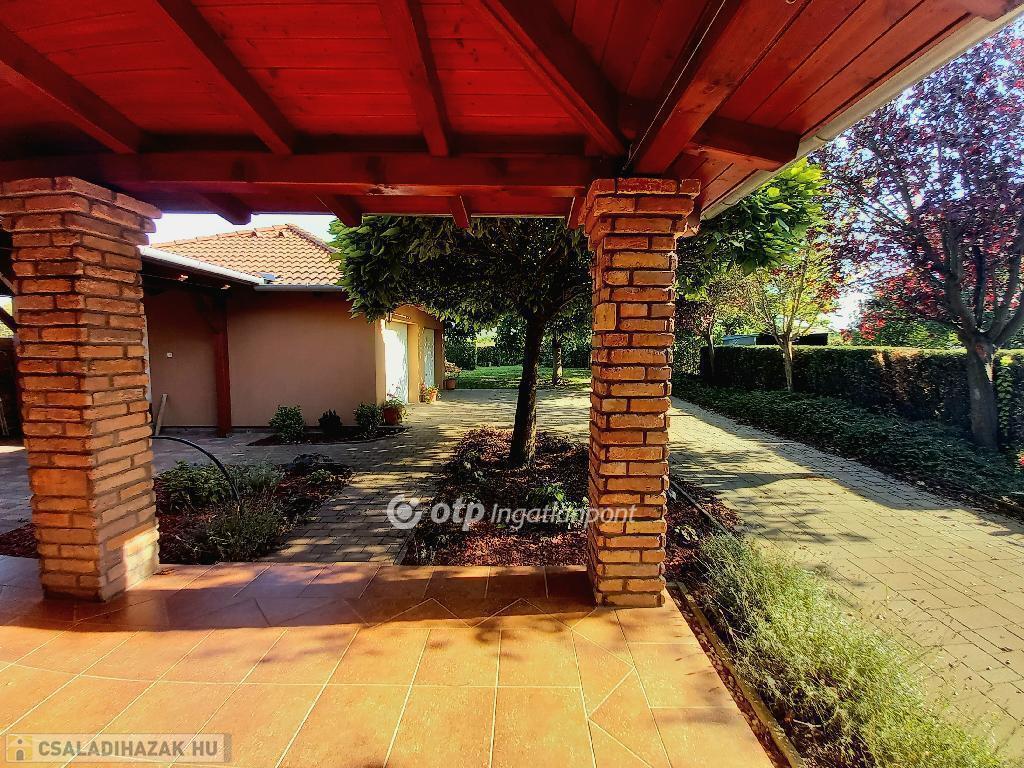 Az épületből az udvar felé egy hatalmas fedett teraszra lépünk ki, ami nemcsak összeköti a házat a kétállásos garázzsal, hanem a családi összejöveteleknek is bőséges helyet biztosít.