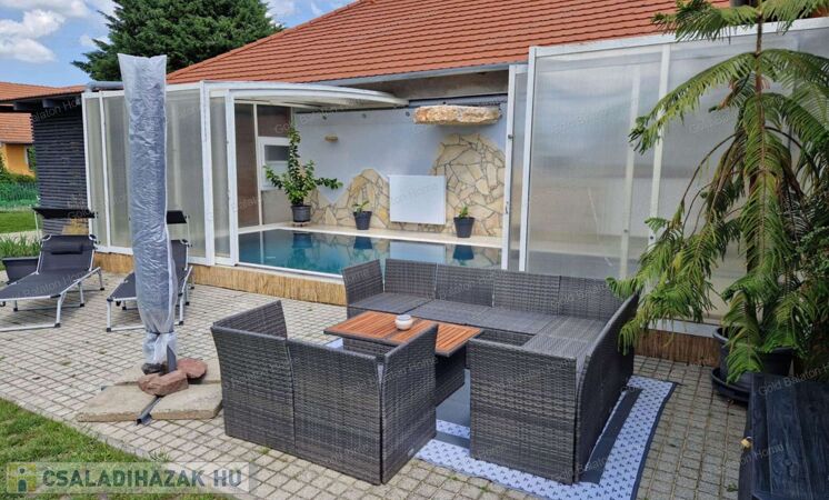 Egyszintes CSALÁDI HÁZ 126 nm-es alapterülettel, plusz 33,8 nm-es apartmannal, úszómedencével, duplagarázzsal és 1 műhelyként is használható garázzsal eladó.