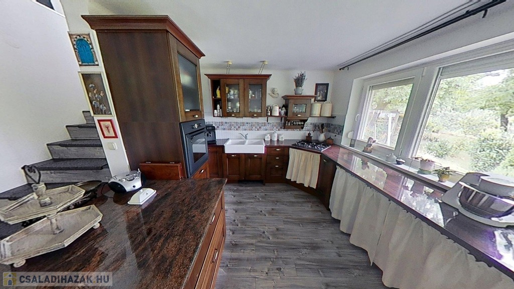 Itt, Bánoson található ez a 2016-ban teljeskörűen felújított ház, egy 1200 nm-es sík telken. Igény esetén a telek akár 4200nm-re is bővíthető. A kétszintes ház földszintjén nagy nappali, konyha, háló- és egy ebből nyíló fürdőszoba, egy külön wc és előszoba osztozik. A konyha bár egy légtér a nappalival, mégis jól elszeparált a nappali életterétől. A nappalinak van egy kisebb, hangulatos része, amit akár le is lehet választani egy gardróbnak, gyermekszobának, stb., bár kár lenne érte, mert jelenleg nagyon jó olvasó/dolgozósarokként működik.