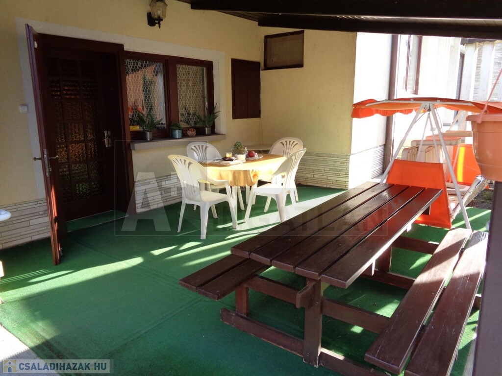 A ház meghosszabításában találunk egy 24 m2-es nyári konyhát, ahonnan kiléphetünk a szuper teraszra és a gyönyörűen parkosított udvarra, kertre. Mindez pedig egy nagyméretű garázzsal zárul. A kert ápolását fúrt kút és egy kerti szerszámtároló is segíti.