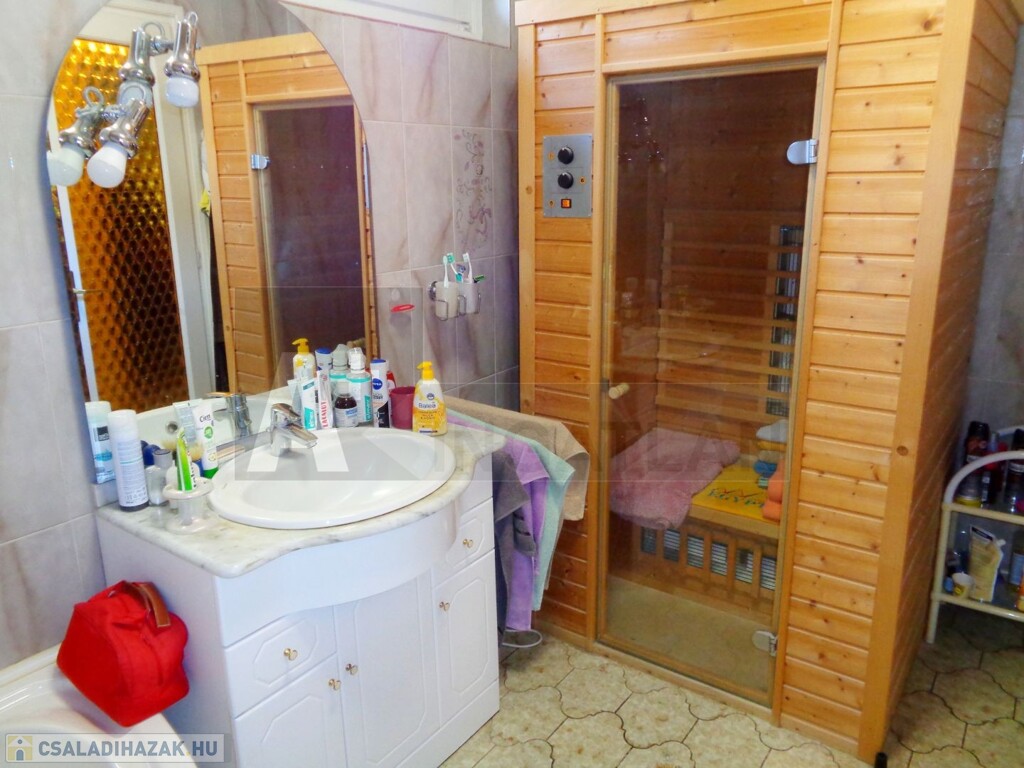 Az alsó szinten találjuk a hatalmas, 55 m2-es, napfényes nappalit, a külön bejáratú konyhát, kamrát, valamint a sarokkádas, infraszaunával felszerelt fürdőszobát. A nappali központi dísze egy csodaszép fatüzelésű kandalló, mely hideg napokon biztosan a család kedvence lesz.