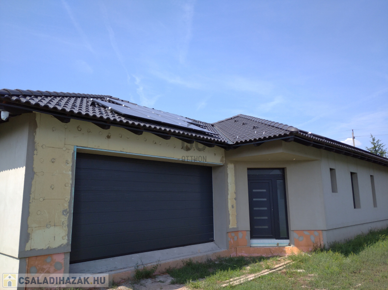 Az előírásoknak megfelelően 5m-es előkerttel és 6 m-es hátsóoldali távolsággal épülő MODERN EGYSZINTES HÁZ, tágas nappali-étkezővel, melyhez kapcsolódik a konyha , illetve a pergolás TERASZ, valamint a konyha teréből nyíló kamra is.