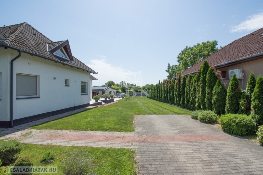 Az utcafronti bejutás kapun keresztül biztosított. A telek, gondozott örökzöldekkel, dísznövényekkel, sövényekkel,.. parkosított valamint 8 zónás öntözőrendszerrel ellátott.