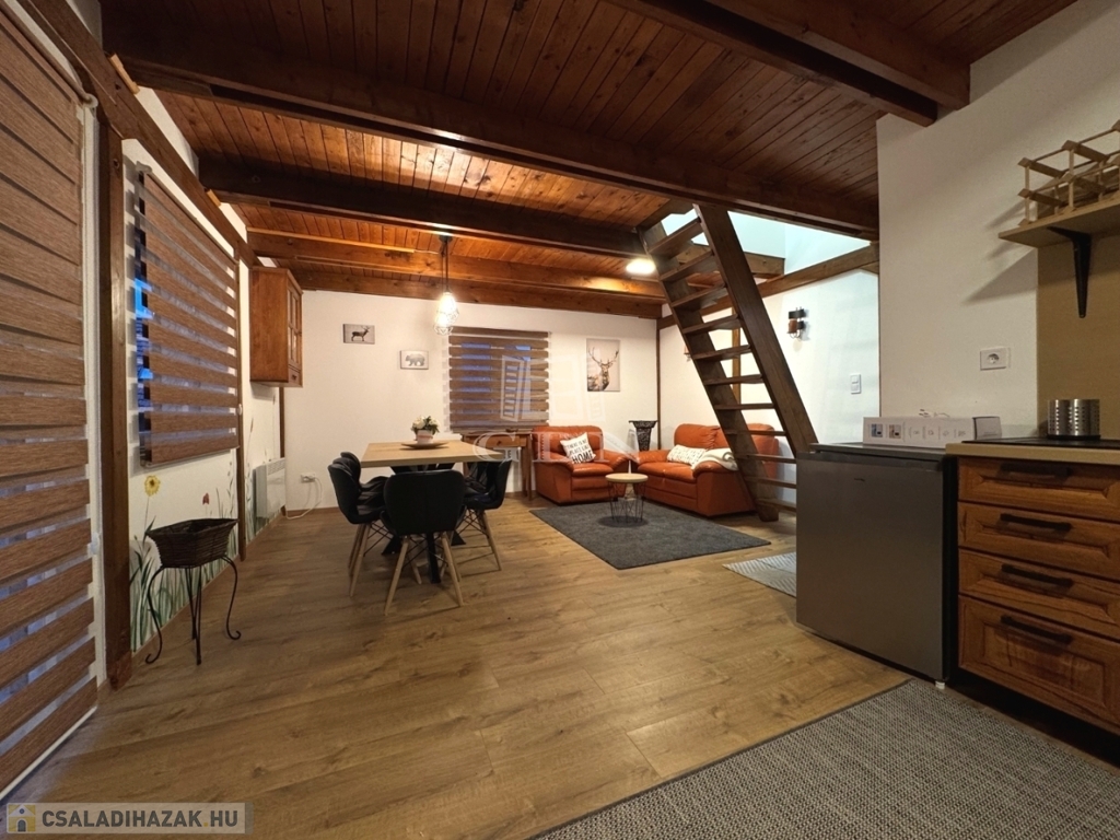 A földszinten amerikai konyha, fürdőszoba és WC található. A tetőtér beépített, két szoba került kialakításra.