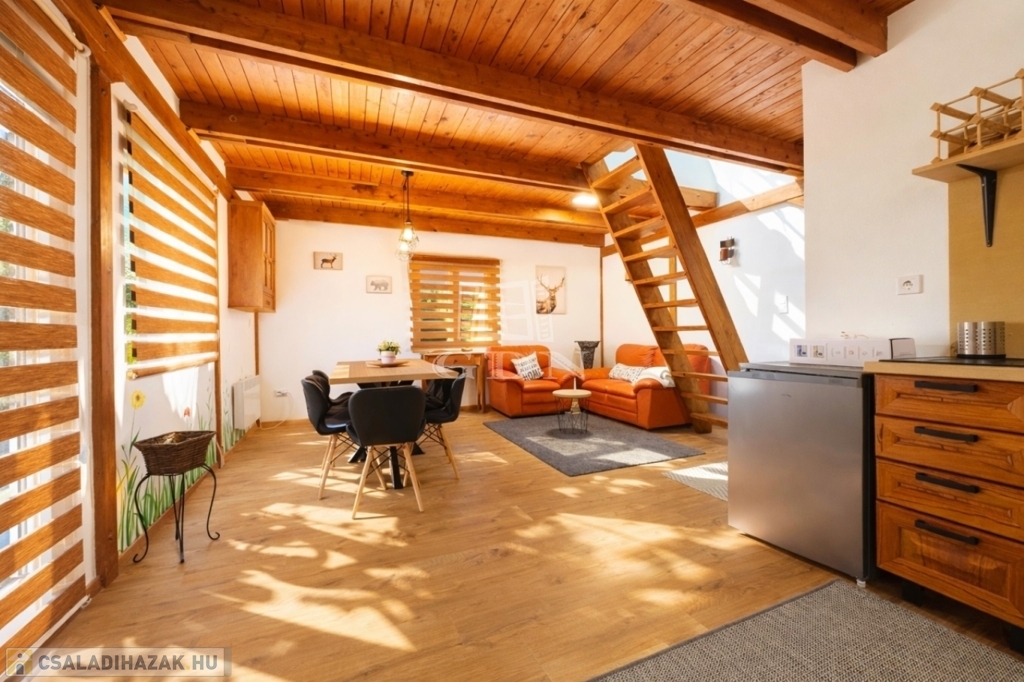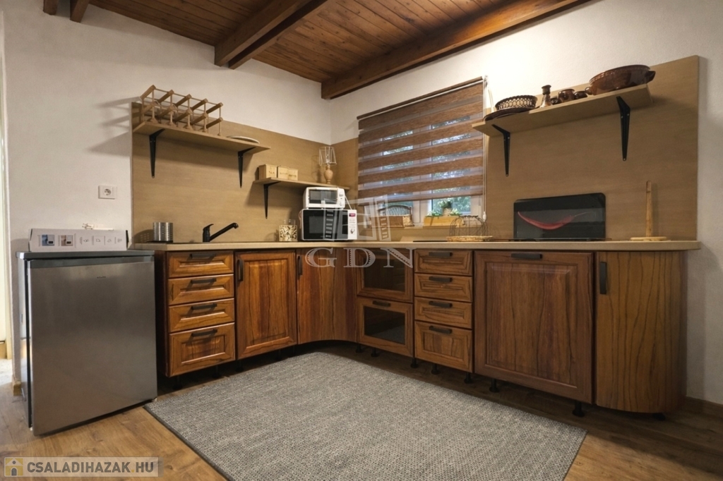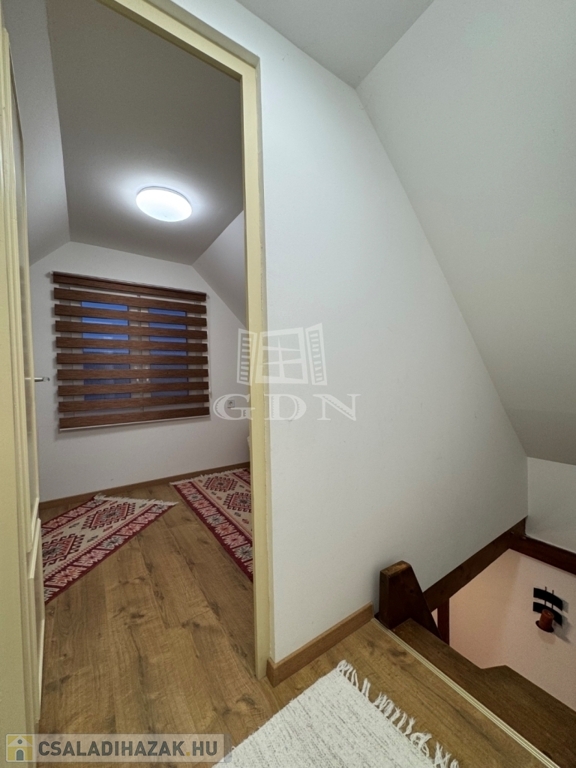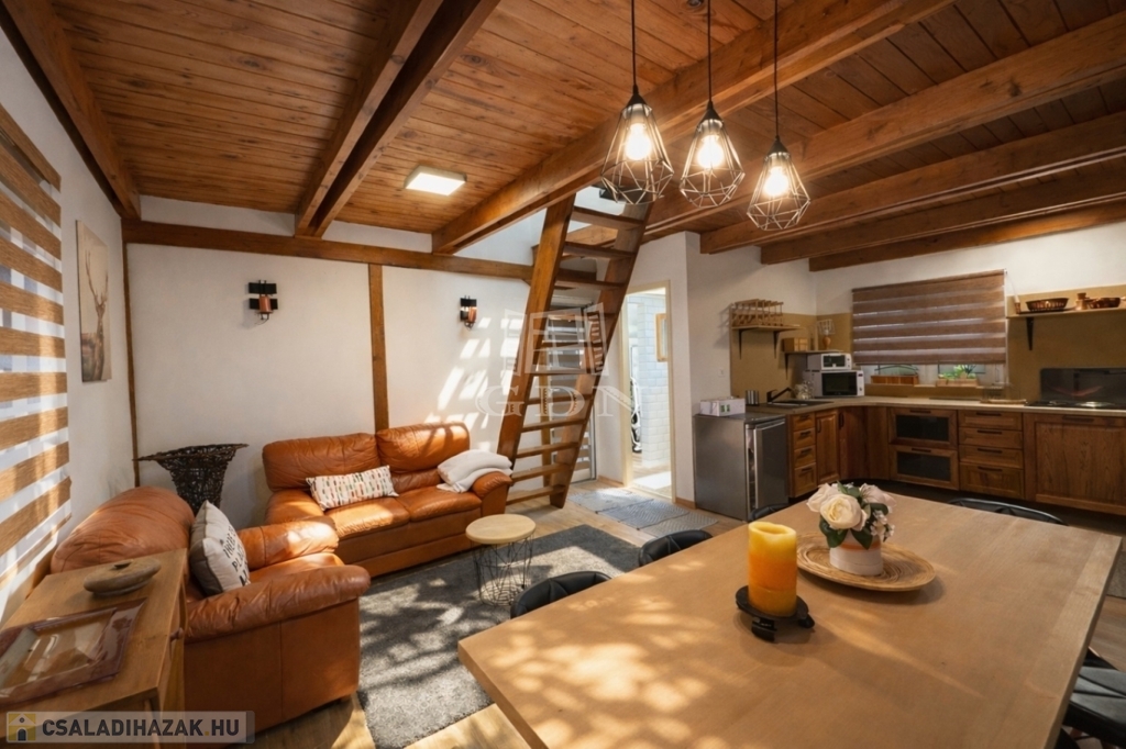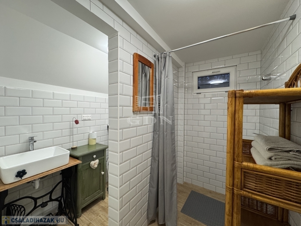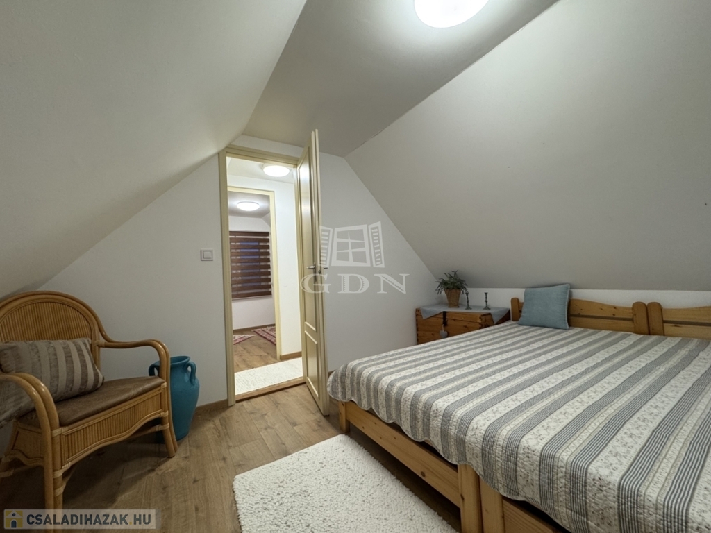 A földszinten amerikai konyha, fürdőszoba és WC található. A tetőtér beépített, két szoba került kialakításra.