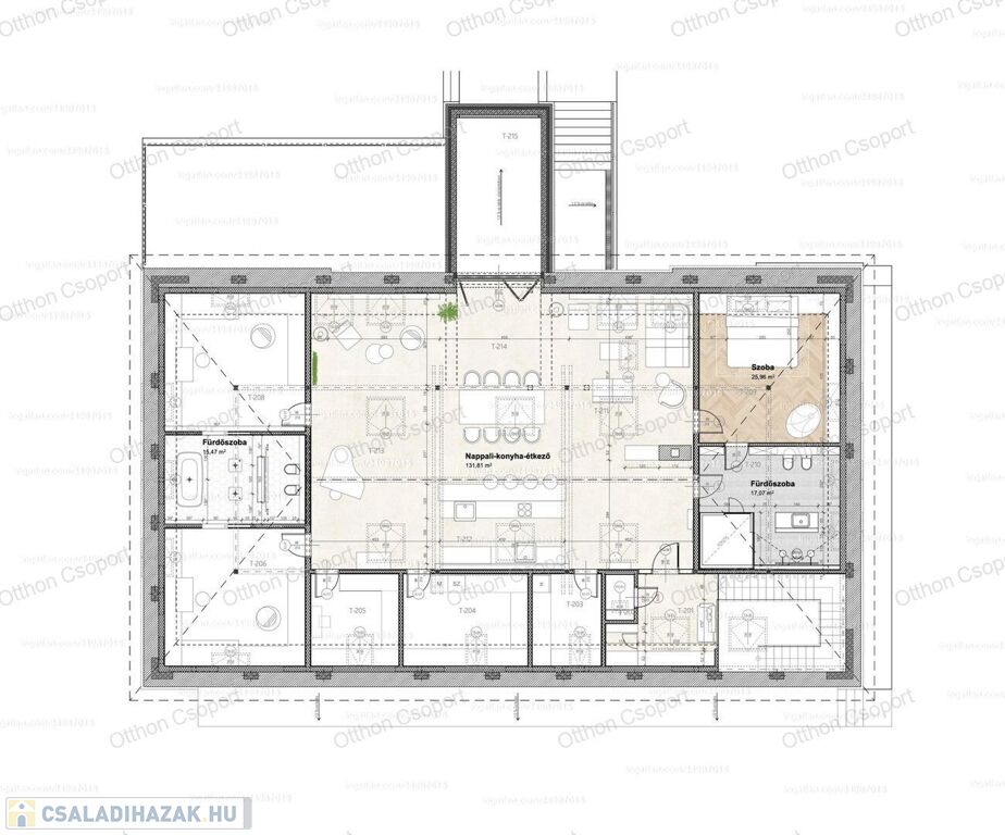 - Egy légterű, amerikai konyhás nappali, gyerek- és, szülőisarokkal (130 m²).
