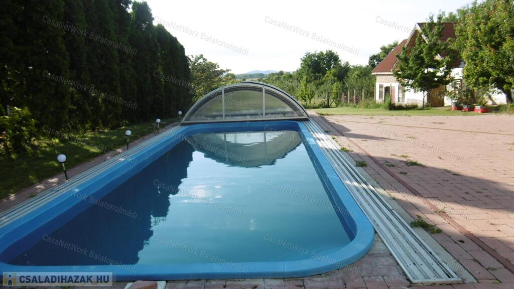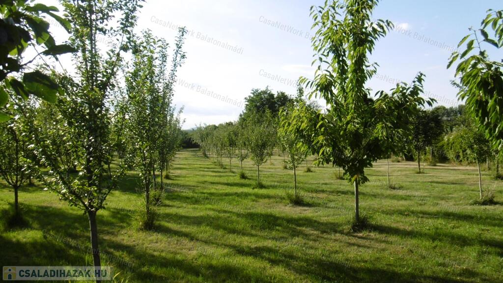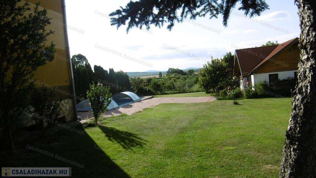 - a gondozott portát két részre osztották: a családi ház melletti füvesített területen helyezkedik el a nagyméretű fedett medence, a kerti kiülő, a virágoskert ... minden, ami egy kényelmes otthonhoz kell; a távolabbi gondozott udvar közel 180 gyümölcsfával büszkélkedik; ha még távolabb tekintünk, zavartalanul elláthatunk egészen a Bakony lábáig