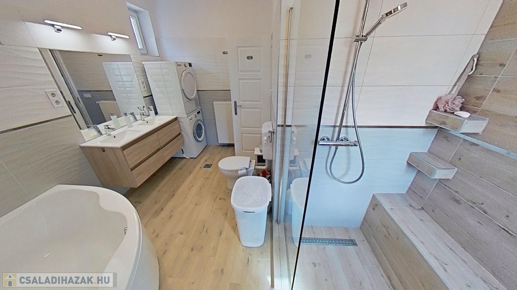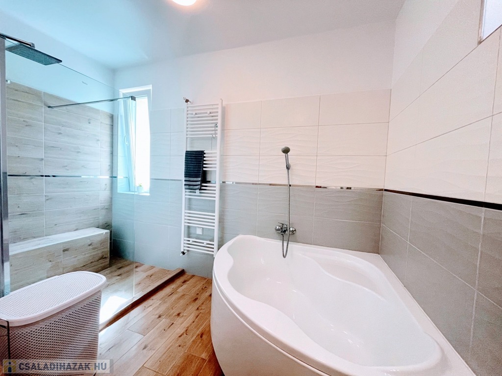 A nagyméretű fürdőben helyett kapott egy gyönyörű, erdei kilátással rendelkező zuhanyzó, egy sarokkád, wc, valamint egy dupla mosdó is. Természetesen egy külön wc is rendelkezésre áll még. A házban az összes szaniter minőségi, Hansgrohe termék.