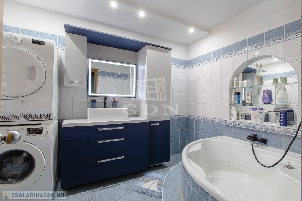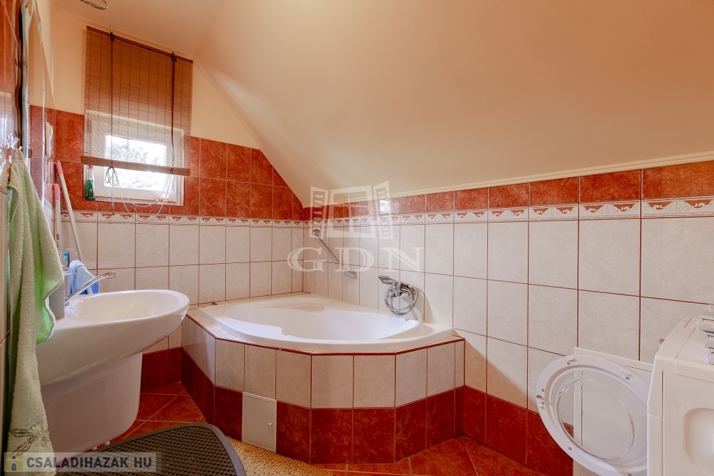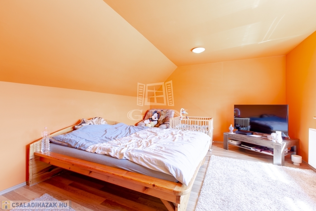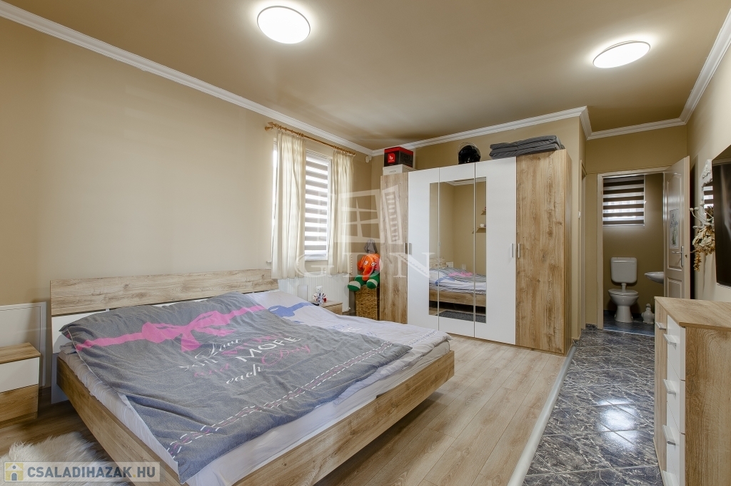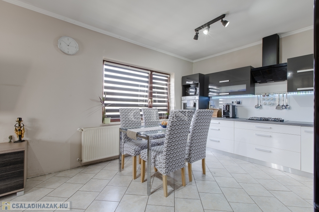Az újabb épület 2 szintes, 2007-ben épült, beton alapra, 30 cm ytong téglából, körbe 5 cm-es dryvit szigeteléssel, beton födémmel. Ezen az épületen viszont 2022-ben tetőcsere történt, bitumenes födém helyett, Lindab cseréplemezes fedést kapott, illetve műanyag thermo nyílászáróval rendelkezik. Ez az ingatlan kiváló állapotú, folyamatosan karbantartott, dupla fürdőszobával, épített kandallóval, riasztóval felszerelt, melyhez tartozik egy közvetlen fedett gépkocsibeálló és egy medence is.