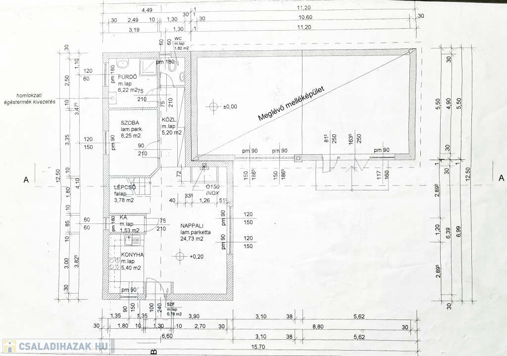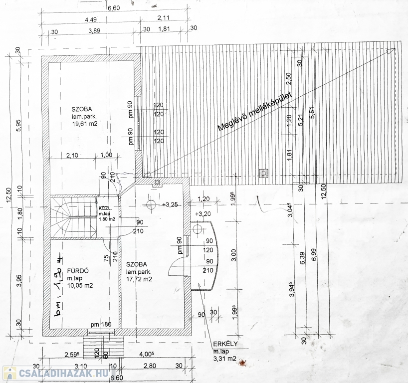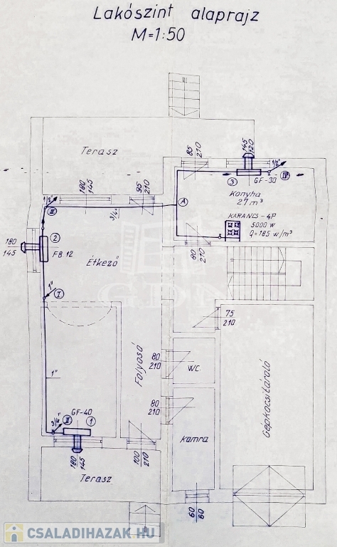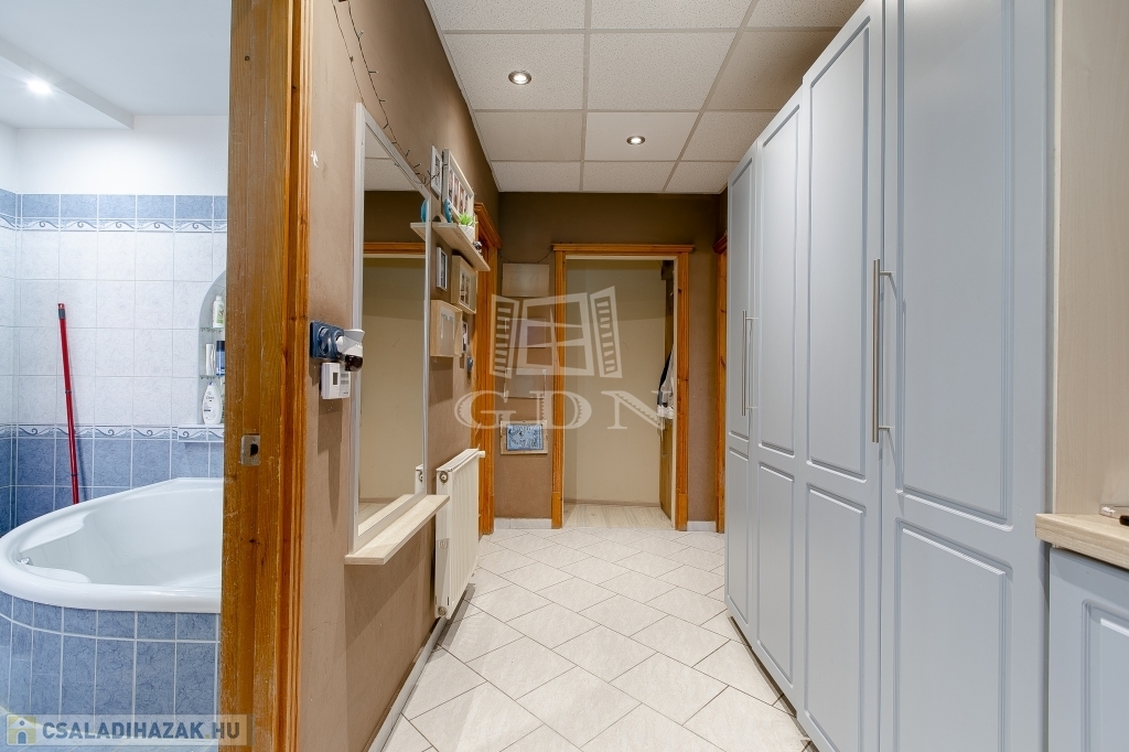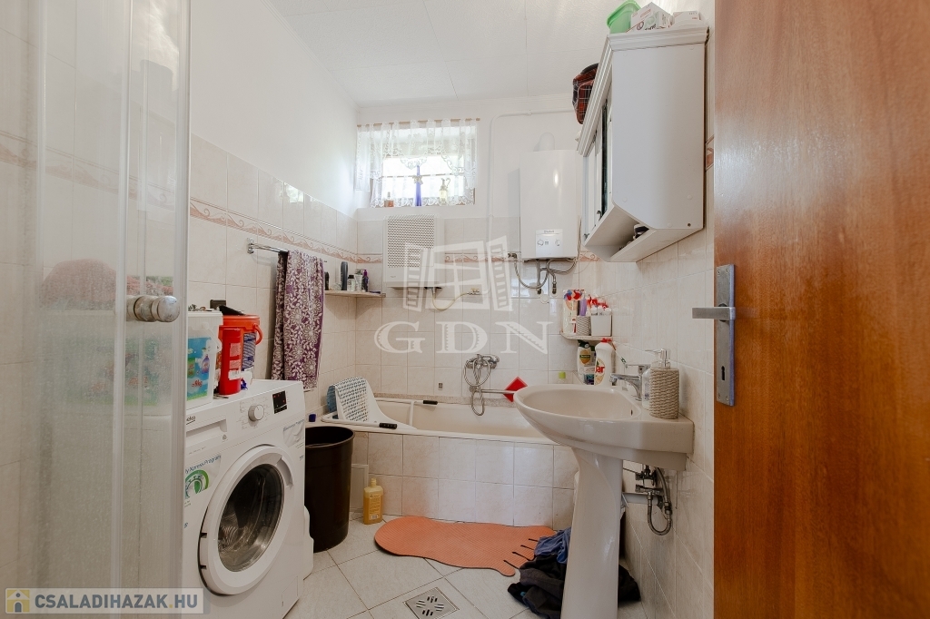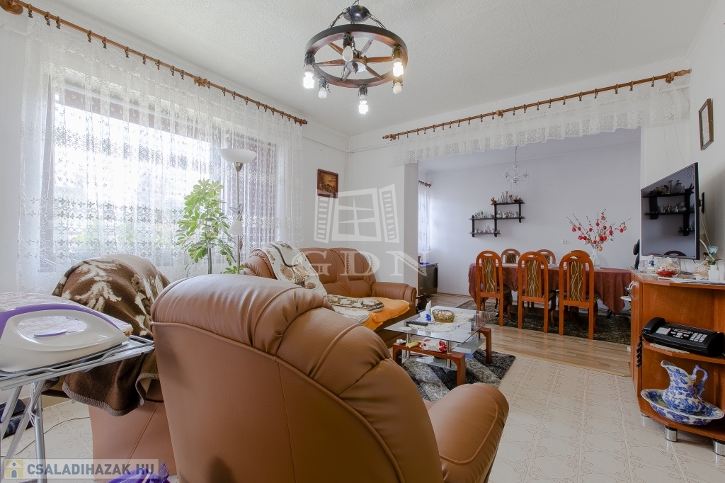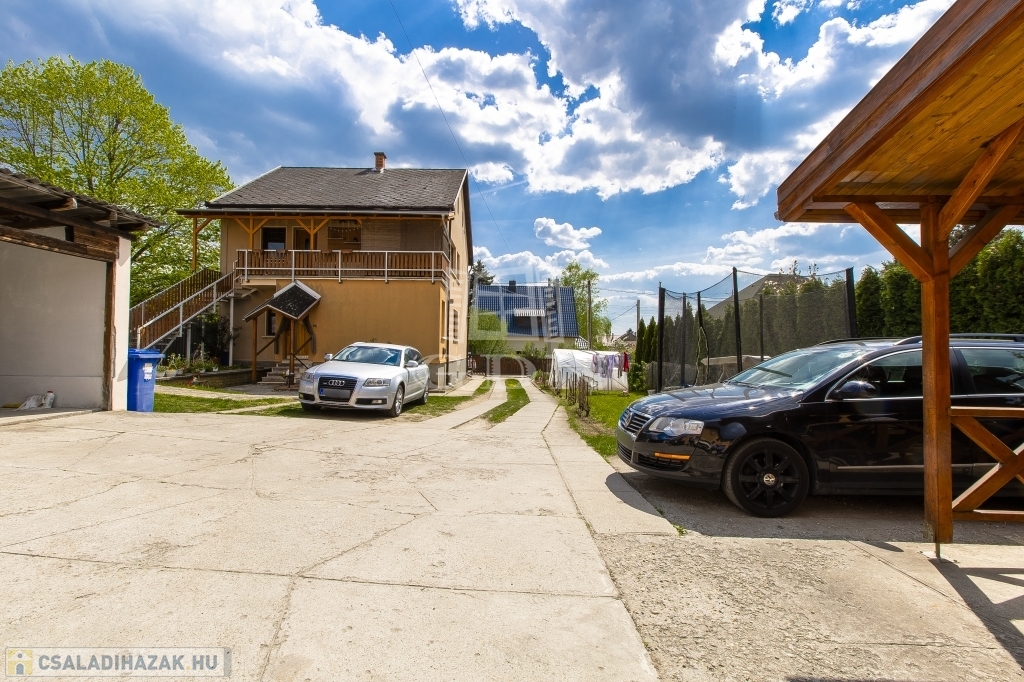 A régebbi épület 3 szintes,1983-ban épült, beton alapra épült, 40 cm-es tégla falazattal, beton födémmel, pala tetővel és fa thermo nyílászárókkal. Ingatlan részben jó állapotú, részben felújítandó, a telek utcához közelebb eső részén helyezkedik el. Az egész épület alatt pince szint van, ahol a kazánház és táróló található. A földszinten, illetve az emeleten, egy-egy külön bejáratú lakás áll rendelkezésünkre, mind két lakásban van külön fürdőszoba, konyha, étkező, nappali és szobák is.