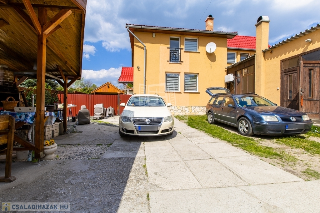 Az udvaron rendelkezésre áll egy 55 nm-es műhely, 2 állásos fedett gépkocsibeálló, illetve egy fedett, jól felszerelt kerti sütögető is.