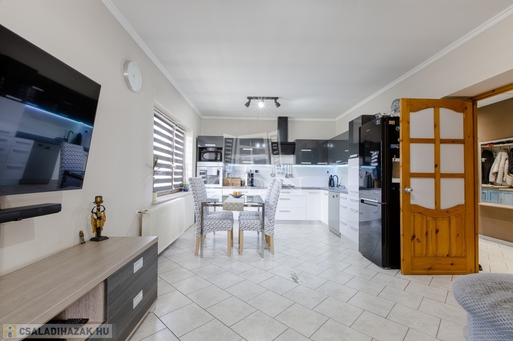 Az újabb épület 2 szintes, 2007-ben épült, beton alapra, 30 cm ytong téglából, körbe 5 cm-es dryvit szigeteléssel, beton födémmel. Ezen az épületen viszont 2022-ben tetőcsere történt, bitumenes födém helyett, Lindab cseréplemezes fedést kapott, illetve műanyag thermo nyílászáróval rendelkezik. Ez az ingatlan kiváló állapotú, folyamatosan karbantartott, dupla fürdőszobával, épített kandallóval, riasztóval felszerelt, melyhez tartozik egy közvetlen fedett gépkocsibeálló és egy medence is.