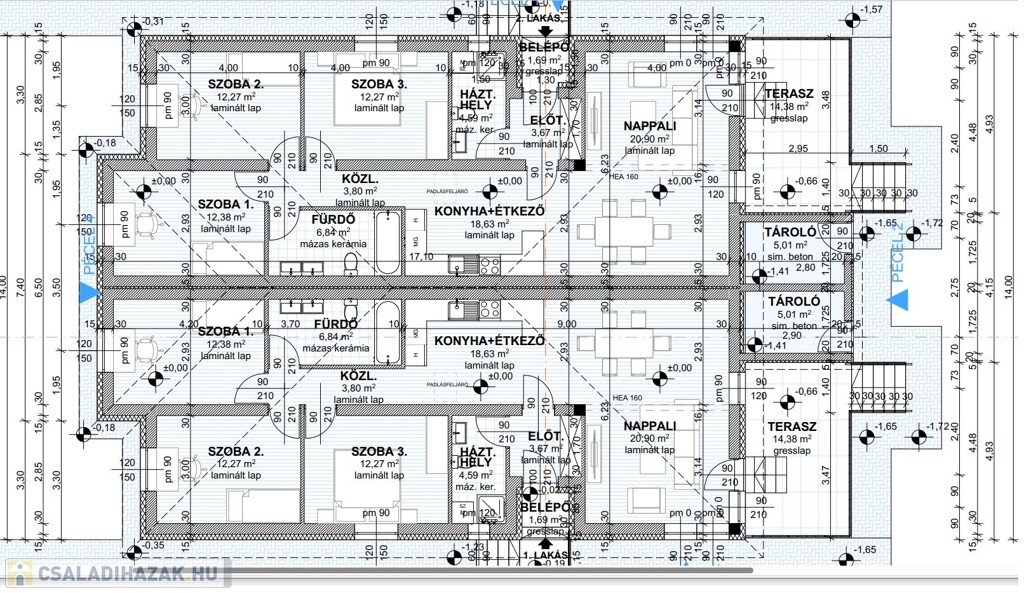 Az ikerházak telek része: 450-450 nm (nincs áthallás, a dupla 30 cm fal és közte 5 cm ásványgyapot szigetelés biztosítja a hangszigetelést)