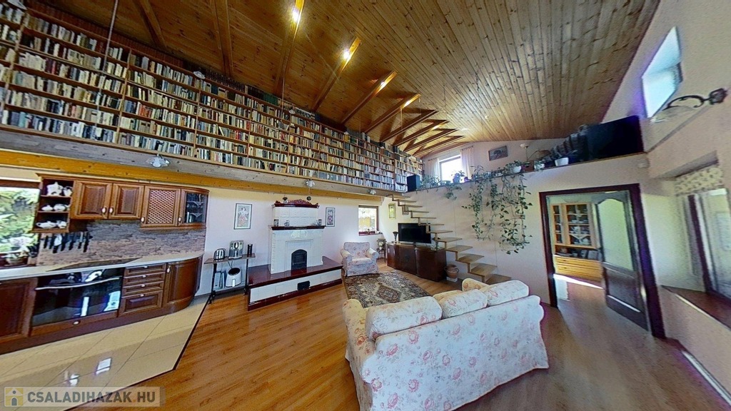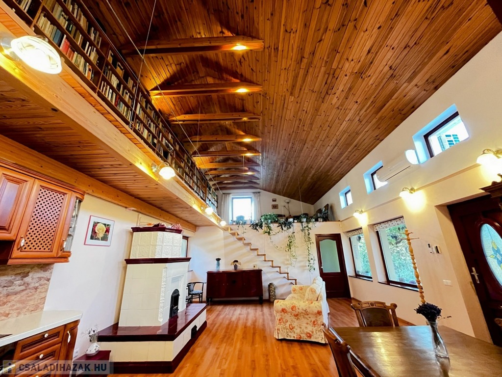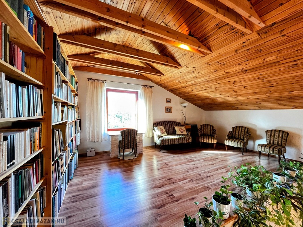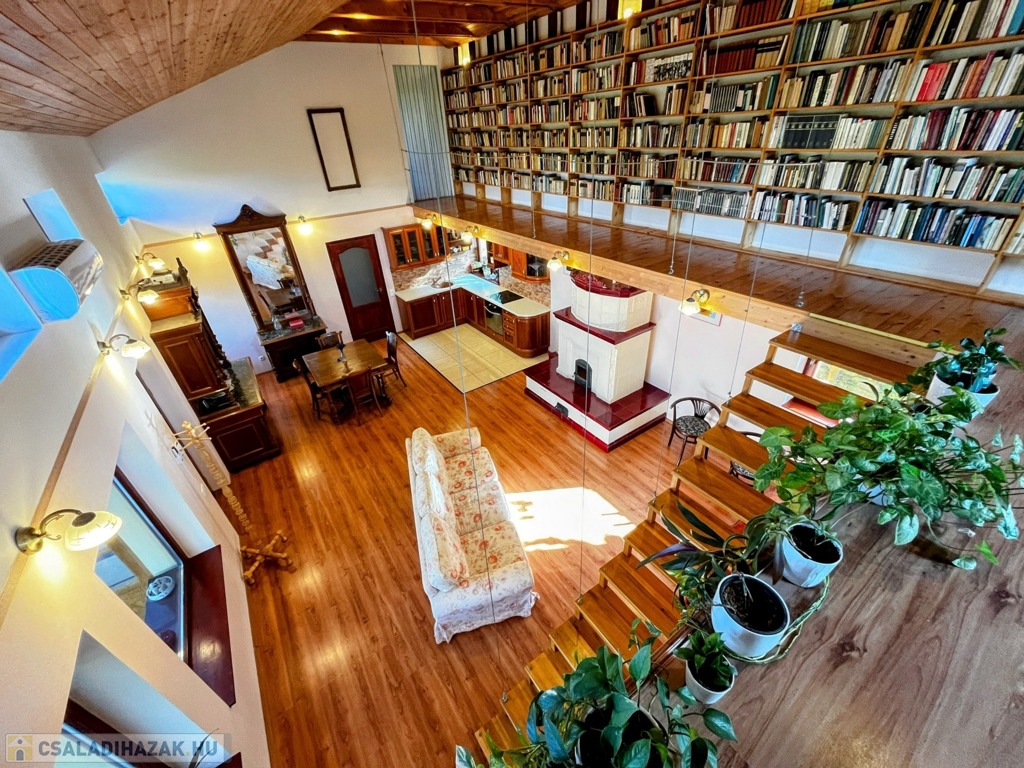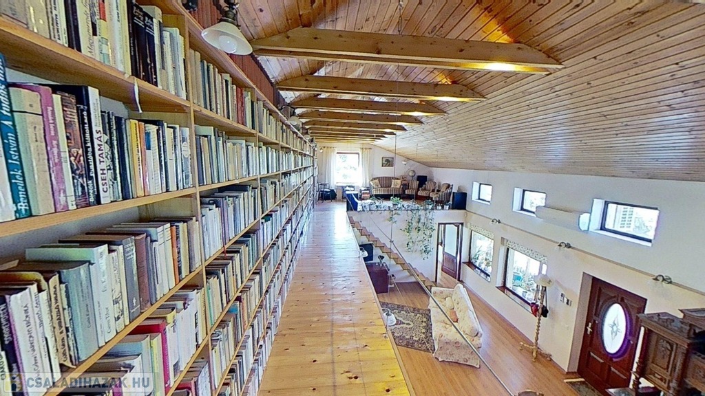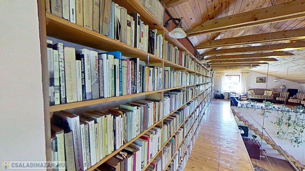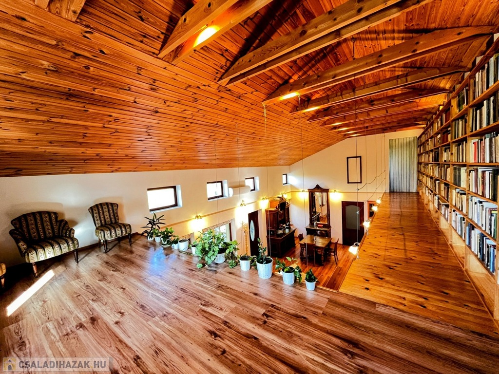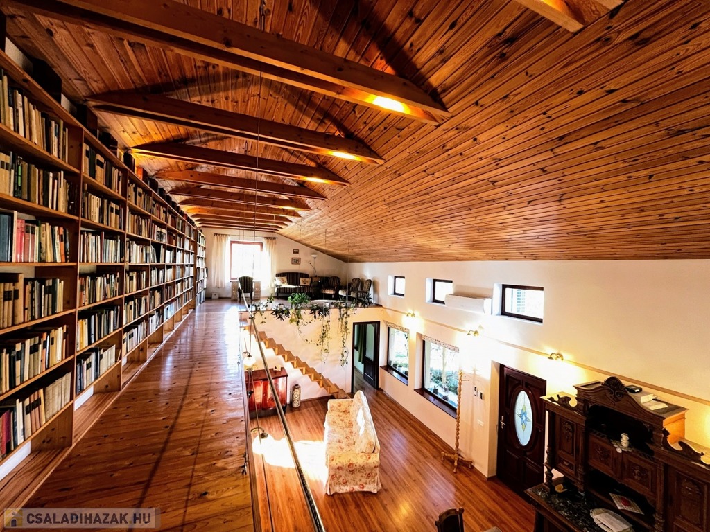 Az emeleten – mely látványos megoldásként szinte egybeolvad a földszinttel – található a galéria, 11 m hosszú könyvtár és a másik hálószoba. Igény szerint a galéria szobává alakítható.