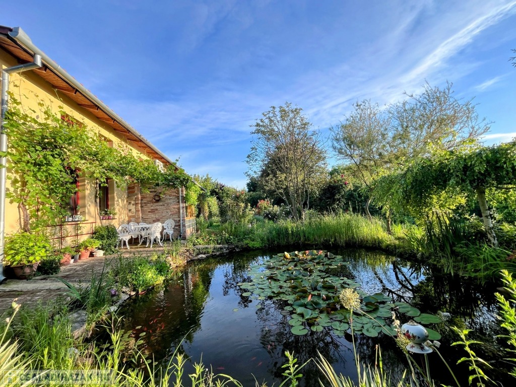 A környezetet egy rózsával körbefuttatott lugas, padok, pihenőhelyek teszik mesebelivé. Közvetlenül a ház mellett került kialakításra egy kerti tó díszhalakkal és tavi növényekkel, fedett és nyitott terasz, konyhakert, valamint a ház mögött kapott helyett egy fedett tároló és tűzifatároló.