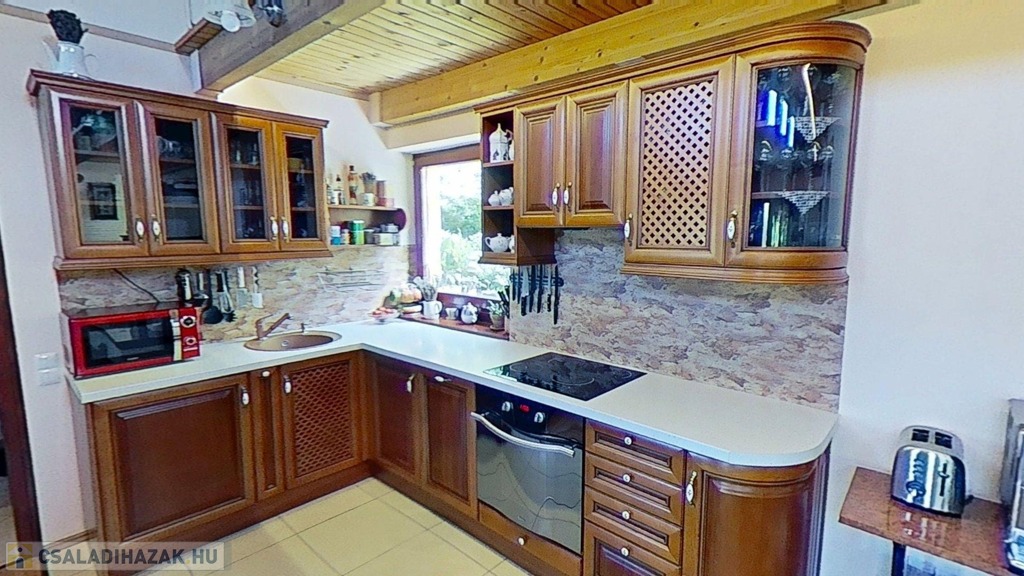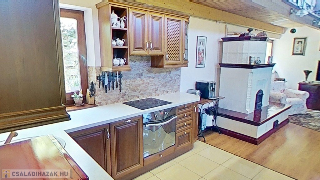 A cseresznyefa konyhabútor egyedileg gyártott, a beépített konyhagépek a vételár részét képezik.