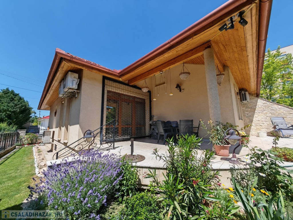 Csendes zsákutcában, 2011-ben épült, egyedi, mediterrán stílusú, 102 m²-es családi ház 400 m²-es parkosított telken eladó.
