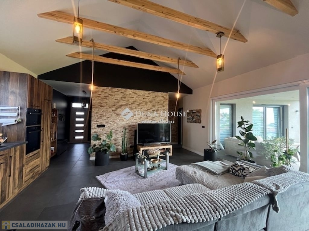 A ház 1220nm-es telken áll, könnyűszerkezetes nagy belmagassággal a nappali teteje szarufáig burkolva van.