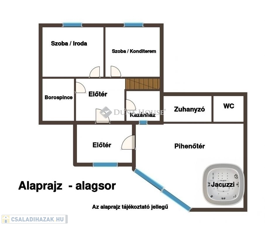* Alsó szinten: pince/tároló + fogadótér, edzőterem, iroda