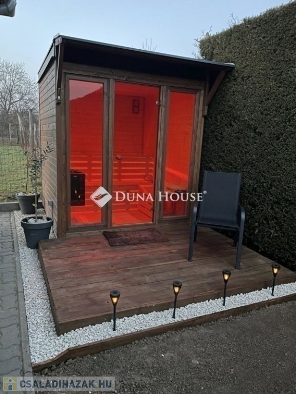 Modern családi ház PécsÚjhegyen napelemmel és dupla garázzsalPécs Újhegy csendes részén, a Barázda utcában eladó egy 2010-ben épült, egyszintes családi ház, amely ideális választás lehet családok számára.164 m² összterület 132 m² lakótér 32 m² kétállásos garázsHelyiségek: amerikai konyhás nappali étkezővel 3 hálószoba gardróbszoba 2 fürdőszoba + vendég WC kamra és háztartási helyiség 20 m² fedett teraszFőbb műszaki jellemzők:Viessmann gázkazánpadlófűtés és radiátorvízteres kandallóHoneywell helyiségenként szabályozható fűtés5,2 kW klíma3x25 Amper 7 kW napelem rendszer szaldó elszámolással 2030.12.31-igExtrák: elektromos alumínium redőnyök elektromos garázskapu és kertkapu riasztórendszer és kamerarendszer vízlágyítóUdvar: * telepített robotfűnyíró* privát kert Leylandi sövénnyel* privát játszótér* kerti sütő / grill rész* 10 m² faház* fatároló* finn szauna és jakuzzi* 10m3-es ciszterna gépesítve öntözésre* gyümölcsfákNyugodt, családi házas környezet, tágas és világos terekkel.Minden adott, hogy ez legyen az új, komfortos otthona.Érdeklődés esetén keressen bizalommal. Tekintsük meg együtt, hogy személyesen is meggyőződhessen, ez amit eddig keresett!