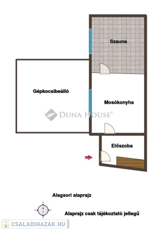 Az alsó szinten mosókonyha, valamint egy szauna kialakítására előkészített helyiség található.