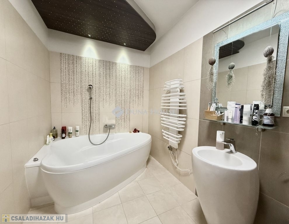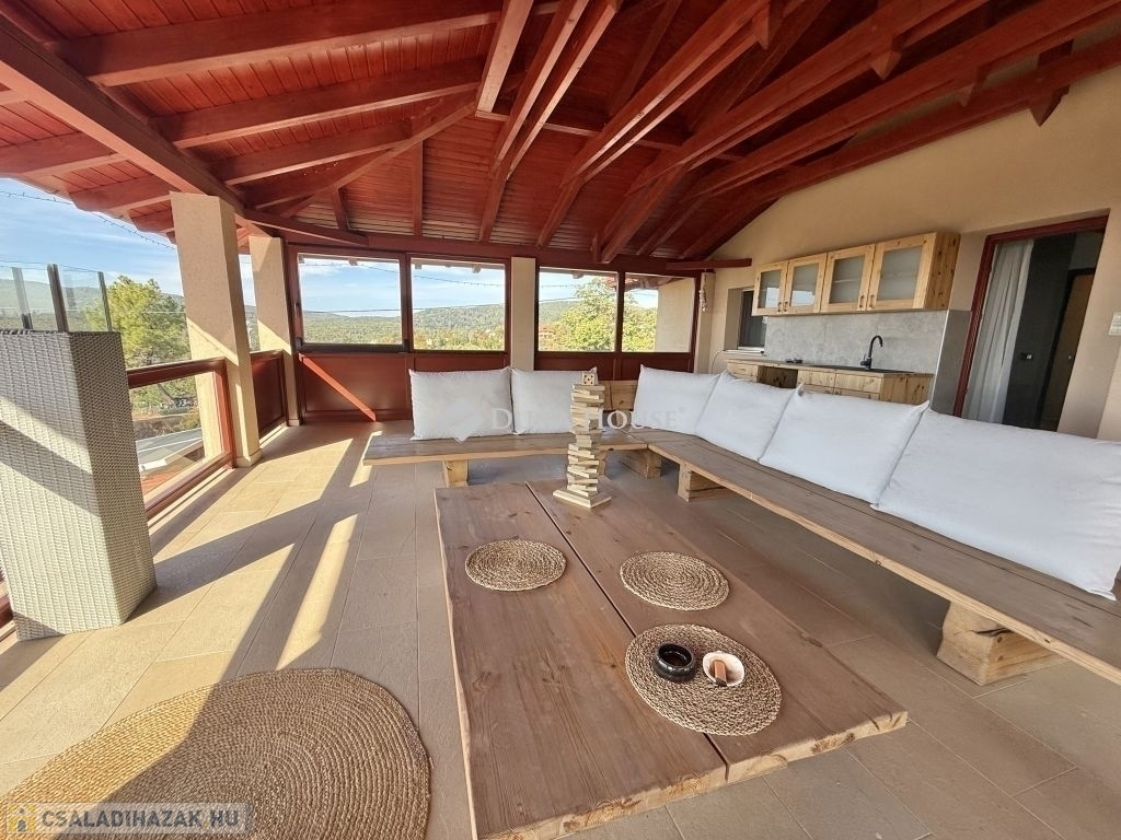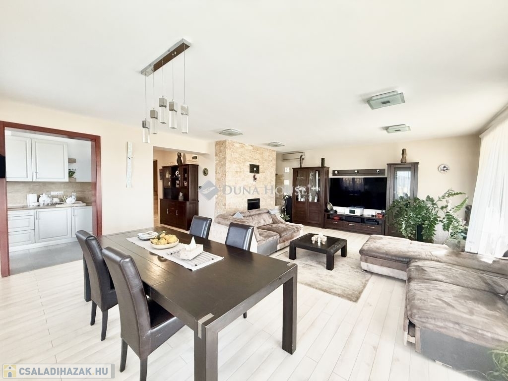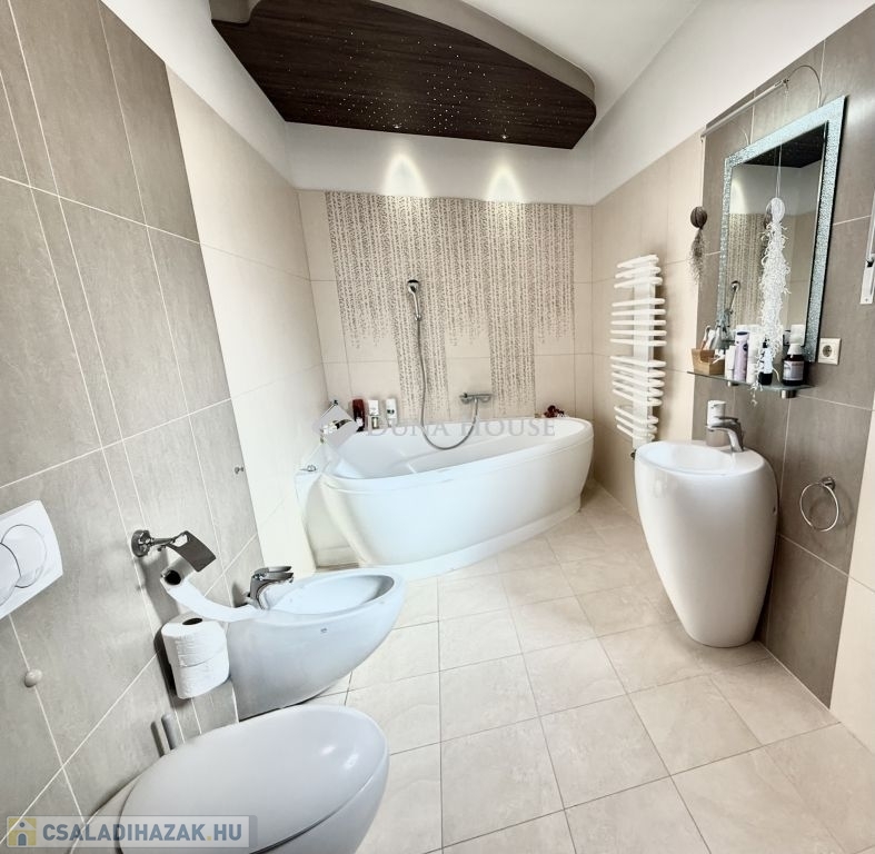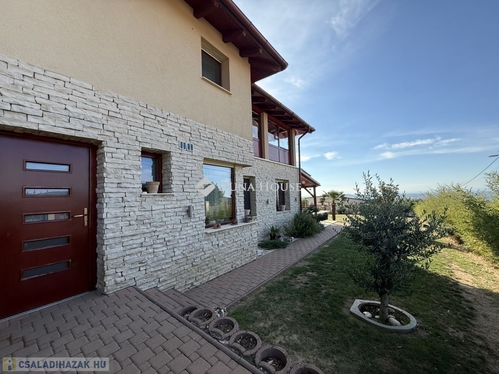 Mecsekoldali panorámás, mediterrán stílusú Prémium családi ház!Eladásra kínálunk egy 2014-ben épült, prémium kategóriás mediterrán családi házat a Mecsekoldal egyik legszebb panorámájú részén. Az ingatlan háromszintes, összesen 275 m² -es, és minden részletében a minőséget és igényességet képviseli.A tágas, napfényes terekkel rendelkező otthon tökéletes választás azoknak, akik a modern technológia, a természet és a kifinomult esztétika harmóniáját keresik. A ház örökpanorámás kilátást kínál a városra és a Mecsek zöldjeire, miközben a környék nyugalma igazi otthoni hangulatot teremt.A belső terek átgondolt elrendezésűek: tágas nappali, kényelmes étkező, vadonatúj, modern konyha, két gyermekszoba, egy hálószoba, két gardrób, két fürdőszoba és két különálló mosdó biztosítja a család kényelmét. A házhoz két nagyméretű terasz, egy óriási pince, valamint gondozott, mediterrán hangulatú kert tartozik automata öntözőrendszerrel és játszótérrel.A kert központi eleme a feszített víztükrű, fűthető-hűthető 4x8 méteres medence, amely masszázs funkcióval és fejzuhannyal is felszerelt, így egész évben a pihenés és feltöltődés helyszíne lehet. A fedett terasz kézzel faragott, rétegragasztott fa szerkezettel, toló-nyitható ablakrendszerrel készült, így a külső és belső terek harmonikusan összekapcsolódnak.Műszaki jellemzőkGlück Kft. által kézzel készített, hossztoldásmentes, rétegragasztott Borovi fenyő nyílászárók, háromrétegű üvegezésselRehau fűtésrendszer: kizárólag padló- és falfűtés, radiátorok nélkülFűtés: gáz, áram, valamint vízteres kandalló. 44 cm vastag Porotherm tégla + 12 cm grafit hőszigetelés megfelel passzív ház követelményeknek 10 kW-os szaldós napelemes rendszer, rendkívül alacsony rezsiköltséggel (csak víz és alapdíjak)Acélszerkezetű, hőszigetelt tető Bramac Római Protector cserépfedéssel .Wifis, távirányítható, hőszigetelt alumínium redőnyök szúnyoghálóval.T-Home optikai internet akár 2 Gb/s sebességgel.Ez a panorámás, energiatakarékos, exkluzív Mecsekoldali villa ritka lehetőség azok számára, akik kompromisszumok nélkül keresnek egy modern, elegáns és egyben otthonos életteret Pécs egyik legnívósabb környékén.Bővebb információért, megtekintésért várom hívását!