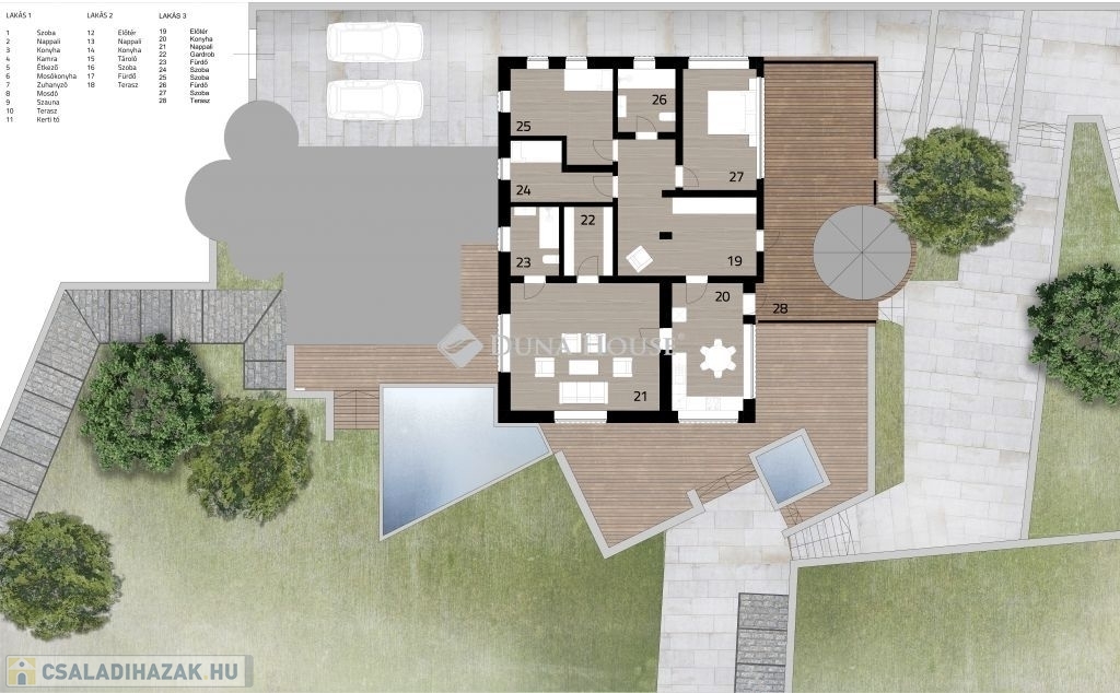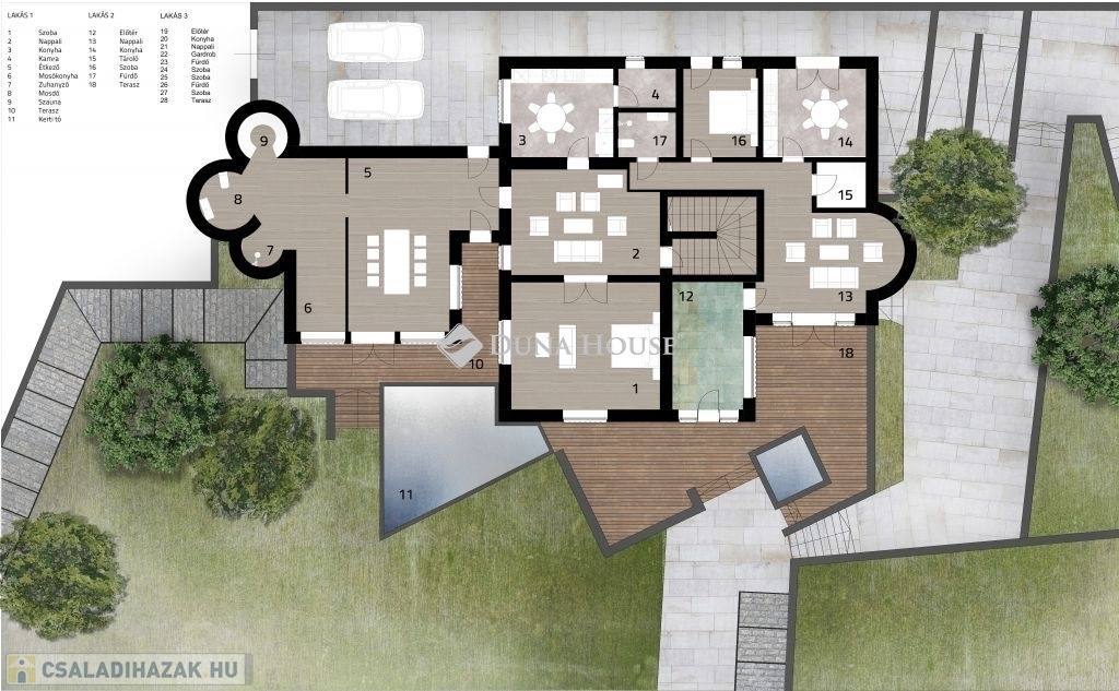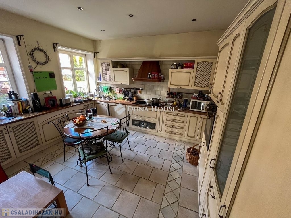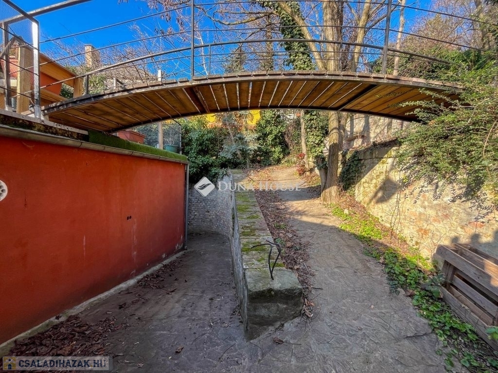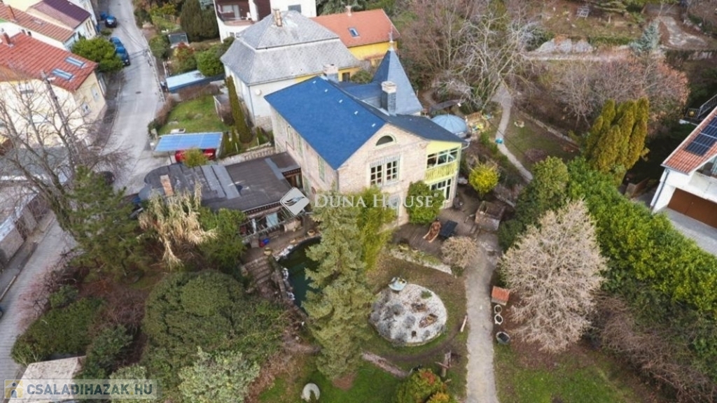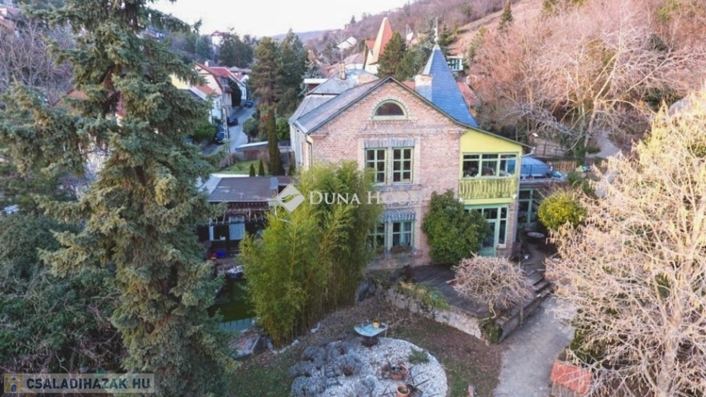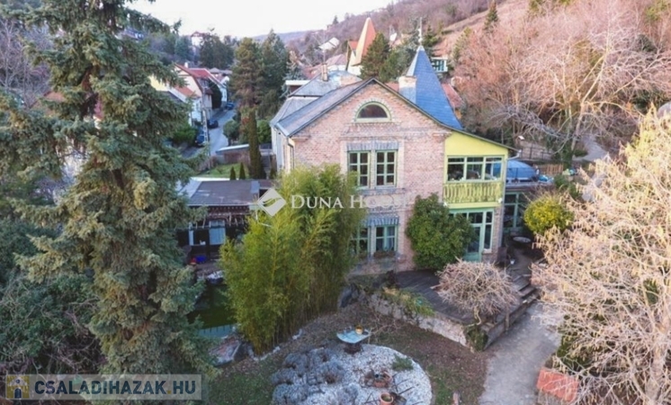 A 2599 m2-es, három telek összevonásából kialakított területen egy patinás, háromgenerációs villa áll, három külön lakrésszel, melyek igény esetén újra összenyithatóak. A telken gyümölcsöskert, halastó, riasztórendszer, szauna, télikert, két fúrt kút, pince, egy 4 állásos garázs és egy kisebb, szintén panorámás házikó is található.