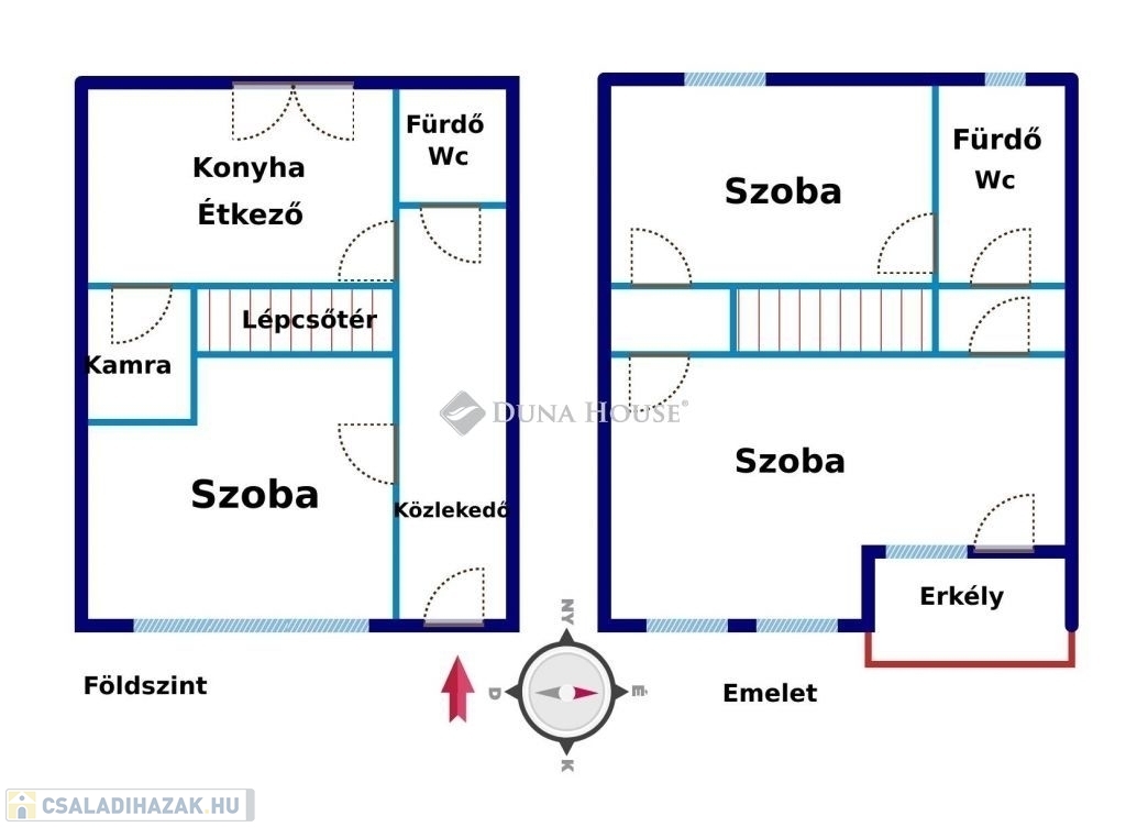 Emeleten két szoba, egyik erkélyes, fürdő/wc, helyezkedik el, innen lépcső vezet a padlástérbe, ami beépíthető,