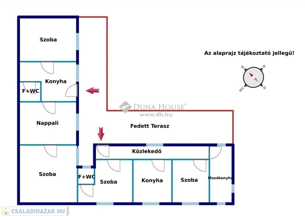 Az épület 2 külön bejáratú részből áll, így 2 generáció együttélésére is alkalmas. A házban összesen 2 nappali, 3 hálószoba, 2 konyha, 2 fürdőszoba+wc, egy mosókonyha, közlekedő, valamint összesen 37 négyzetméternyi fedett terasz található.