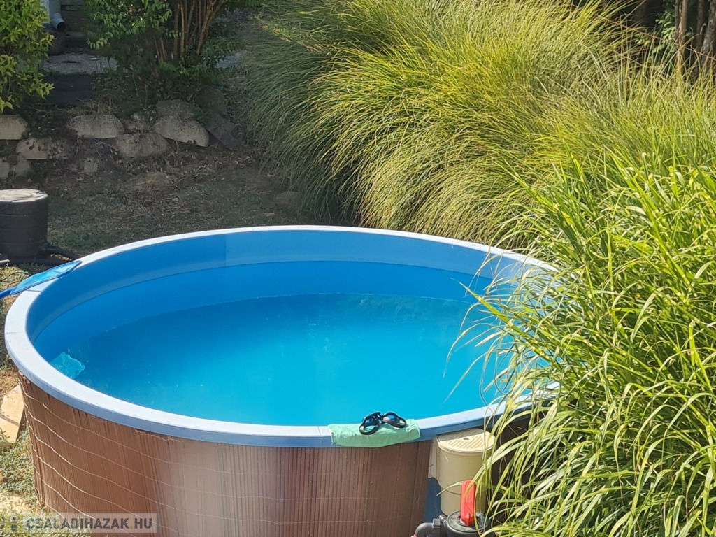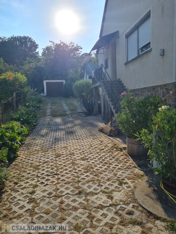 A 1304 m²-es telek keleti tájolású, gondozott, lejtős kialakítású. Az udvarban fúrt kút biztosítja az öntözést, emellett kisméretű medence és melléképület is található, amelyben barkácsműhely és pince kapott helyet. A hátsó, lépcsősen kialakított, bekerített telekrész ideális veteményesnek vagy pihenőkertnek.