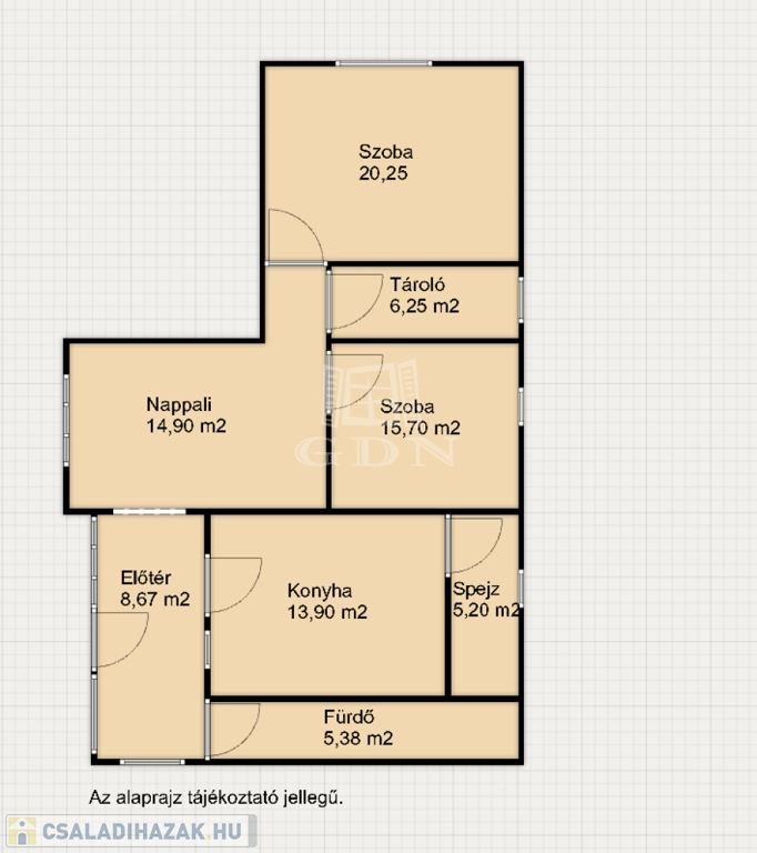 - 90 m2-en ad helyet egy előtér - folyosó együttesnek, 3 szobának, egy konyhának, egy kamrának, egy tárolónak, valamint egy fürdőkáddal és toalettel felszerelt fürdőnek.