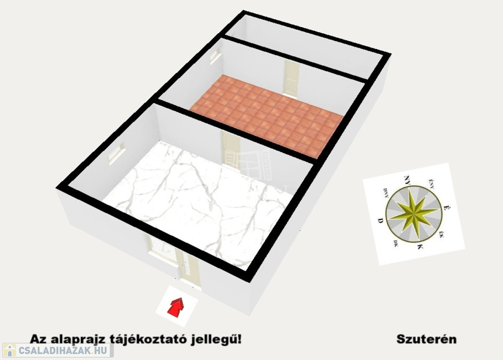 • Földszint: előszoba, nappali, konyha, fürdőszoba, 2 szoba